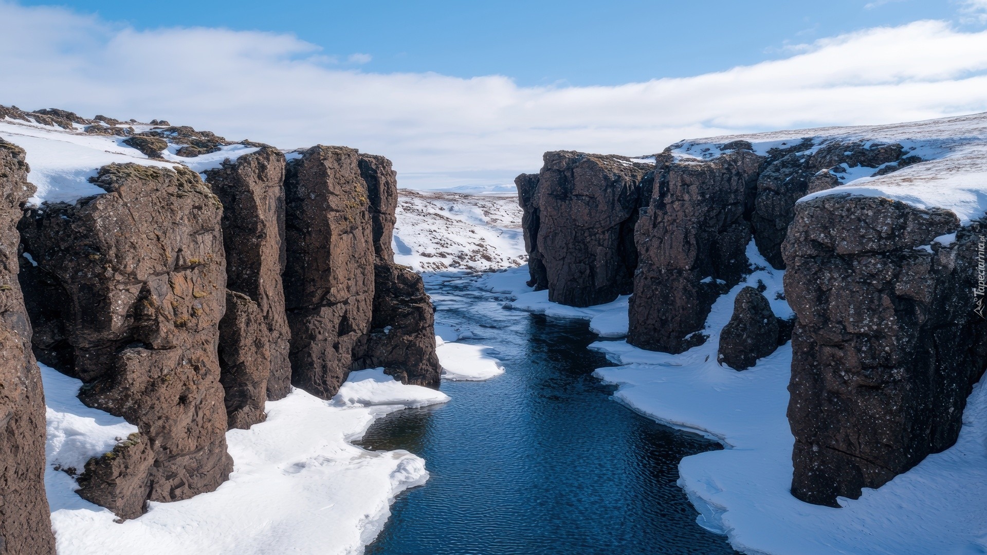 Edytor tapety: Ośnieżone skały i rzeka w wąwozie