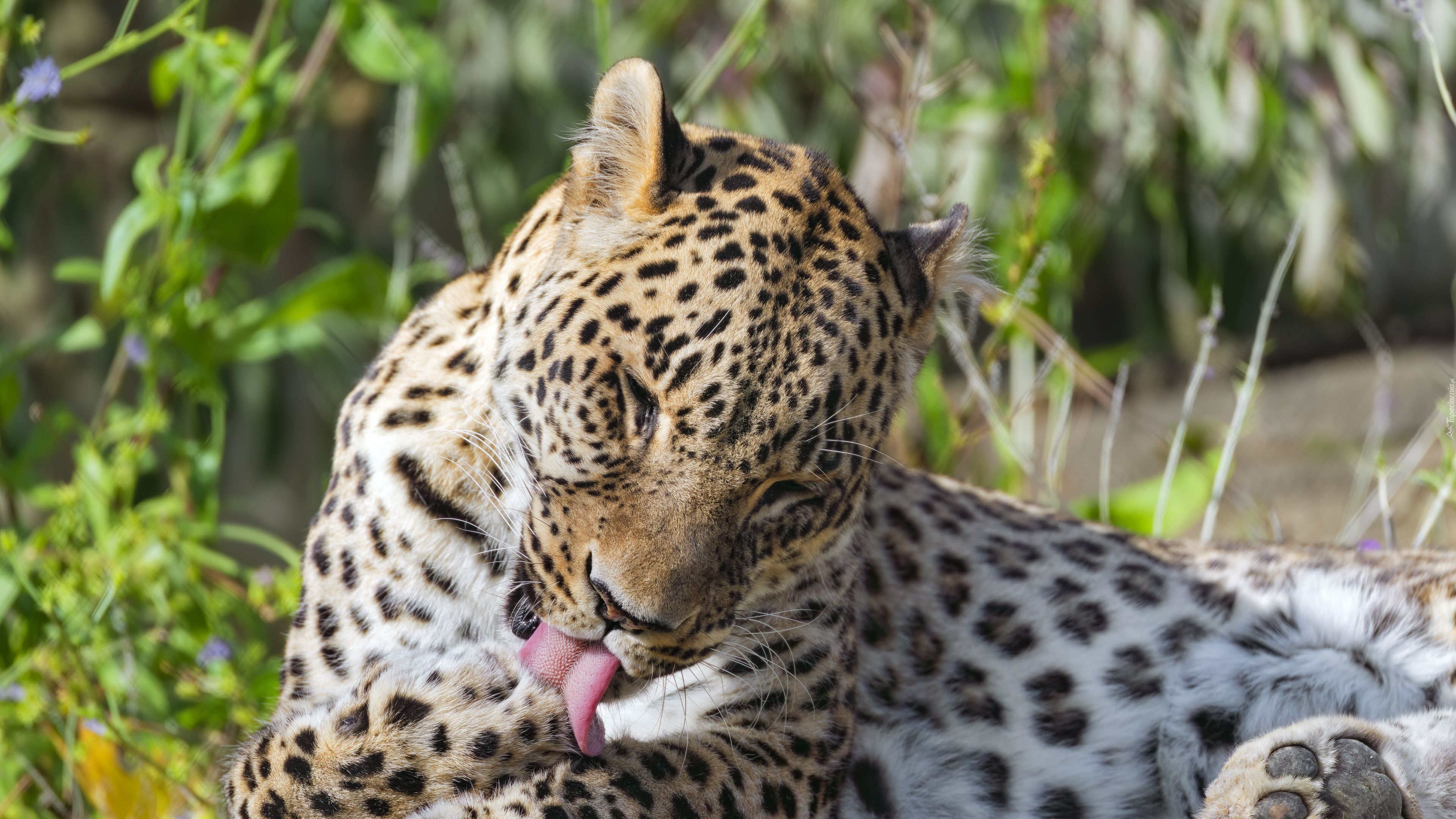 Edytor tapety: Lampart leżący na trawie liżący łapę