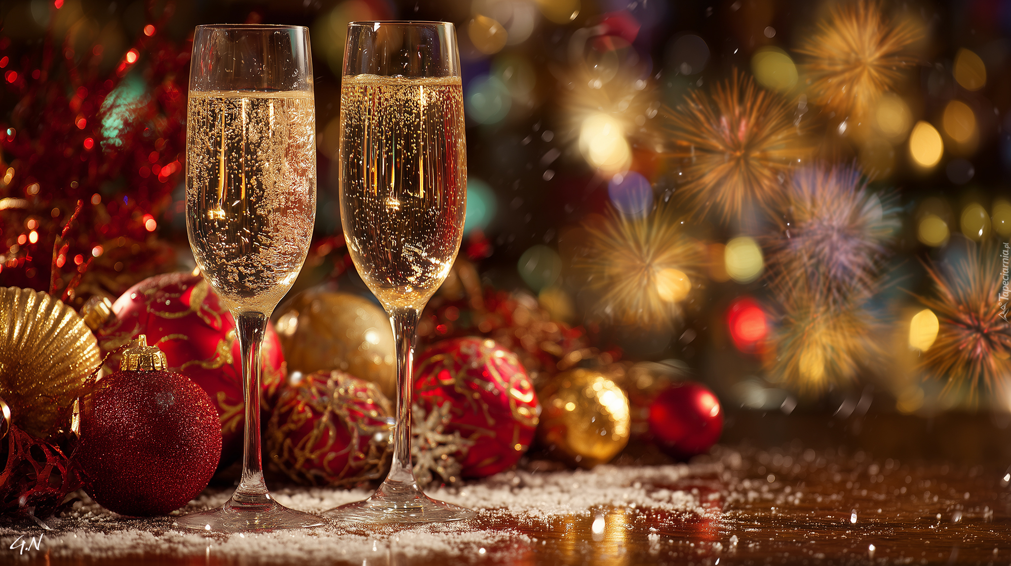 Edytor tapety: Dwa kieliszki z szampanem obok bombek i fajerwerków