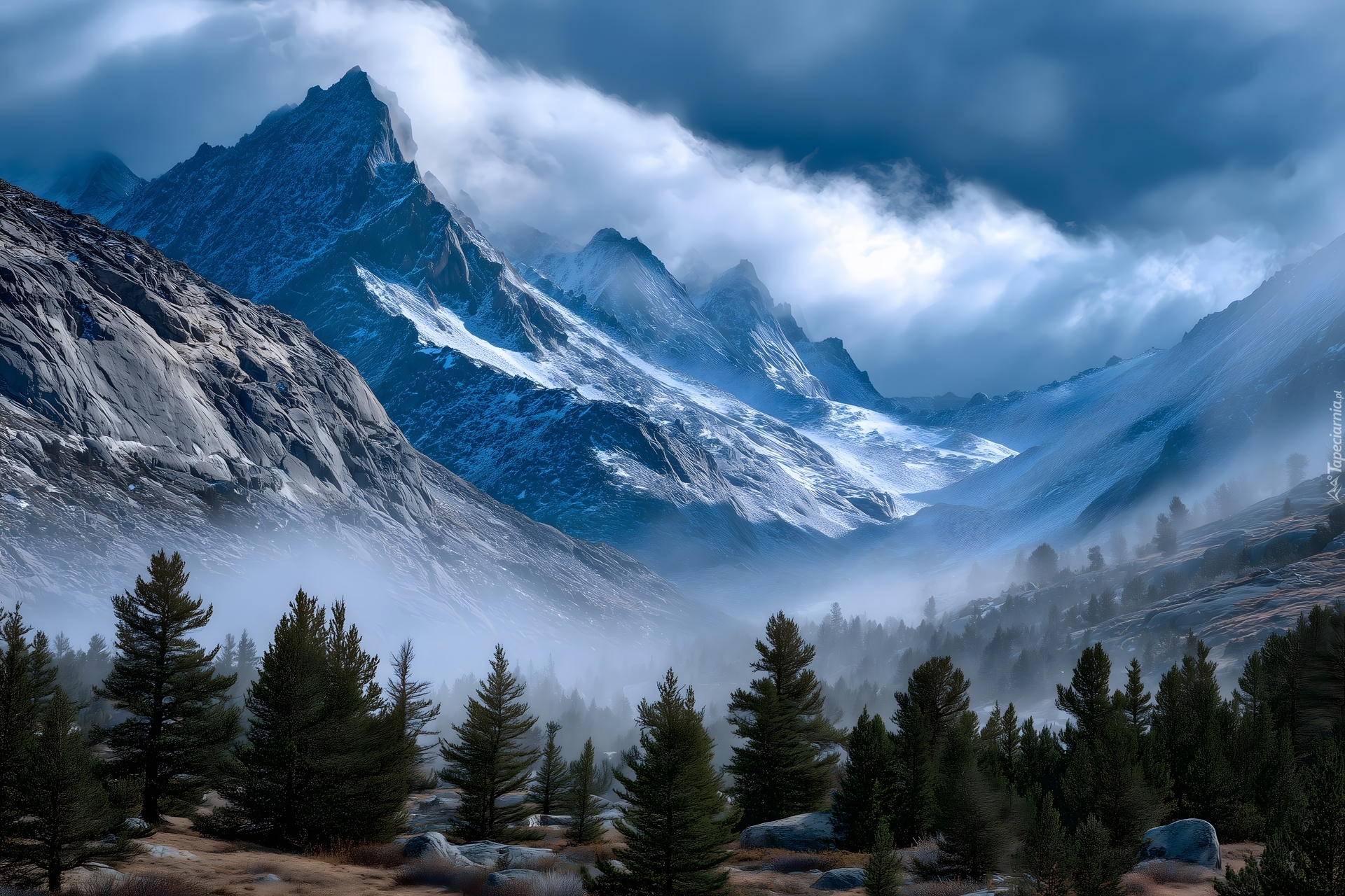 Edytor tapety: Zamglone drzewa w dolinie i ośnieżone górskie szczyty