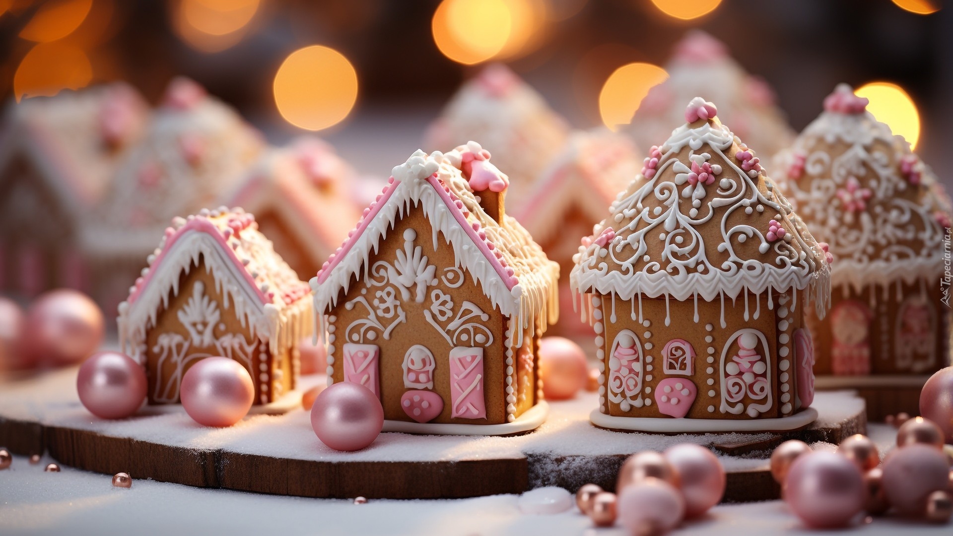 Edytor tapety: Cztery domki z piernika obok różowych bombek