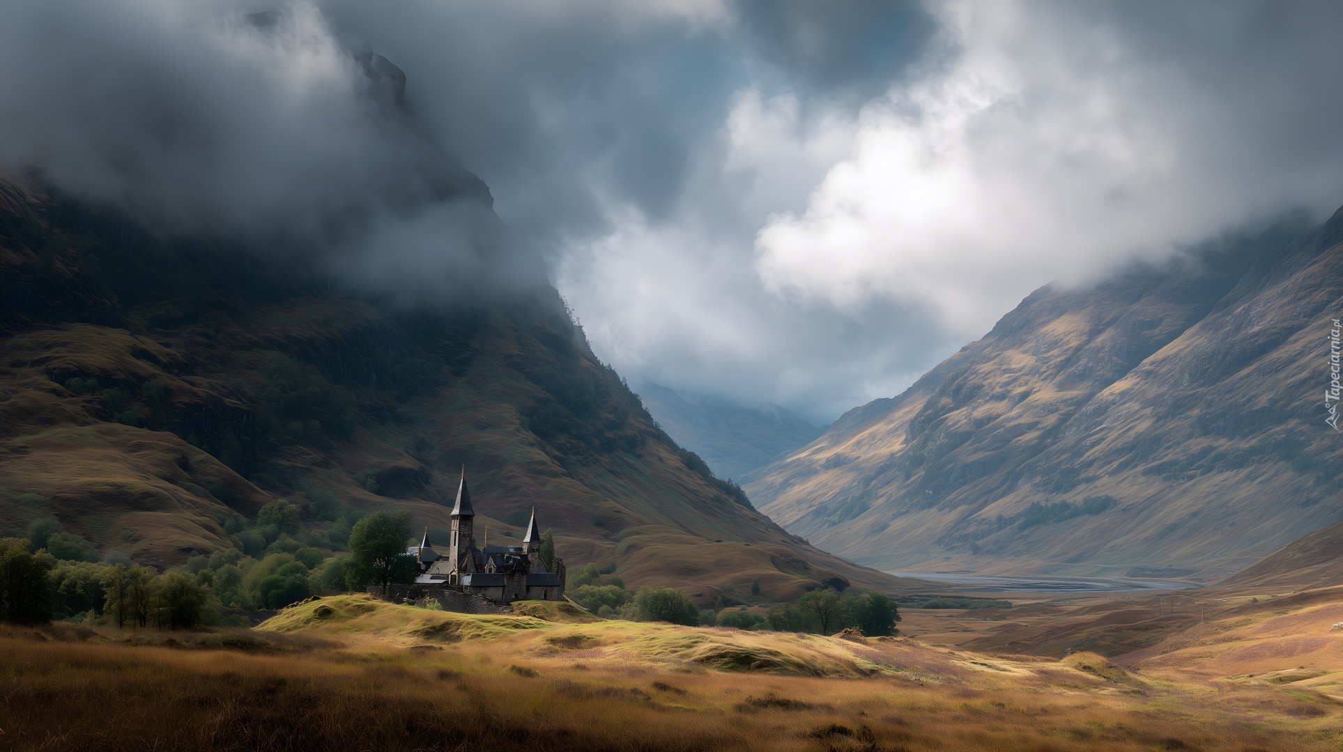 Edytor tapety: Zamek w dolinie i chmury nad górami