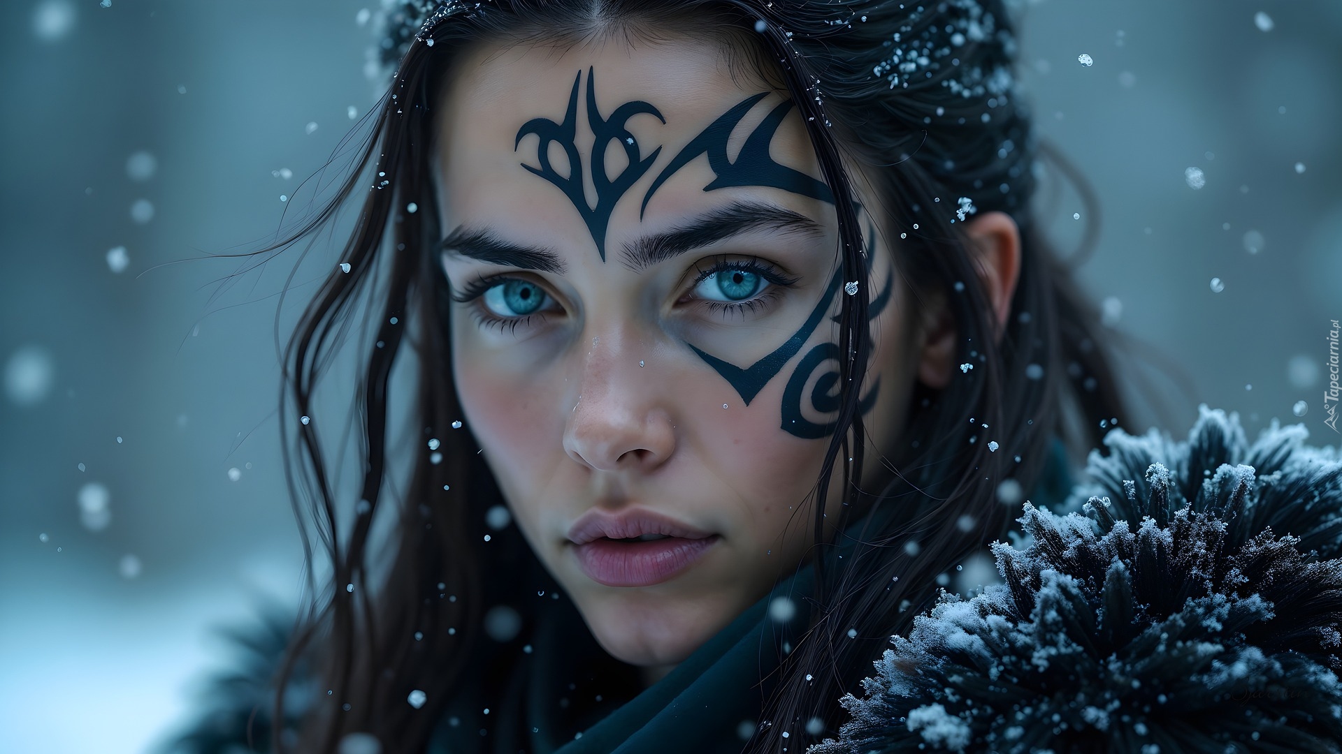 Edytor tapety: Niebieskooka brunetka z tatuażem na twarzy