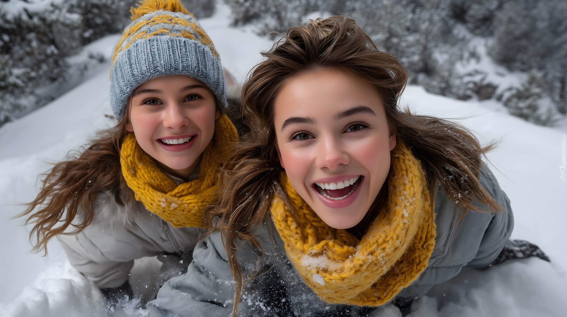 Edytor tapety: Dwie roześmiane dziewczyny w zimowej scenerii