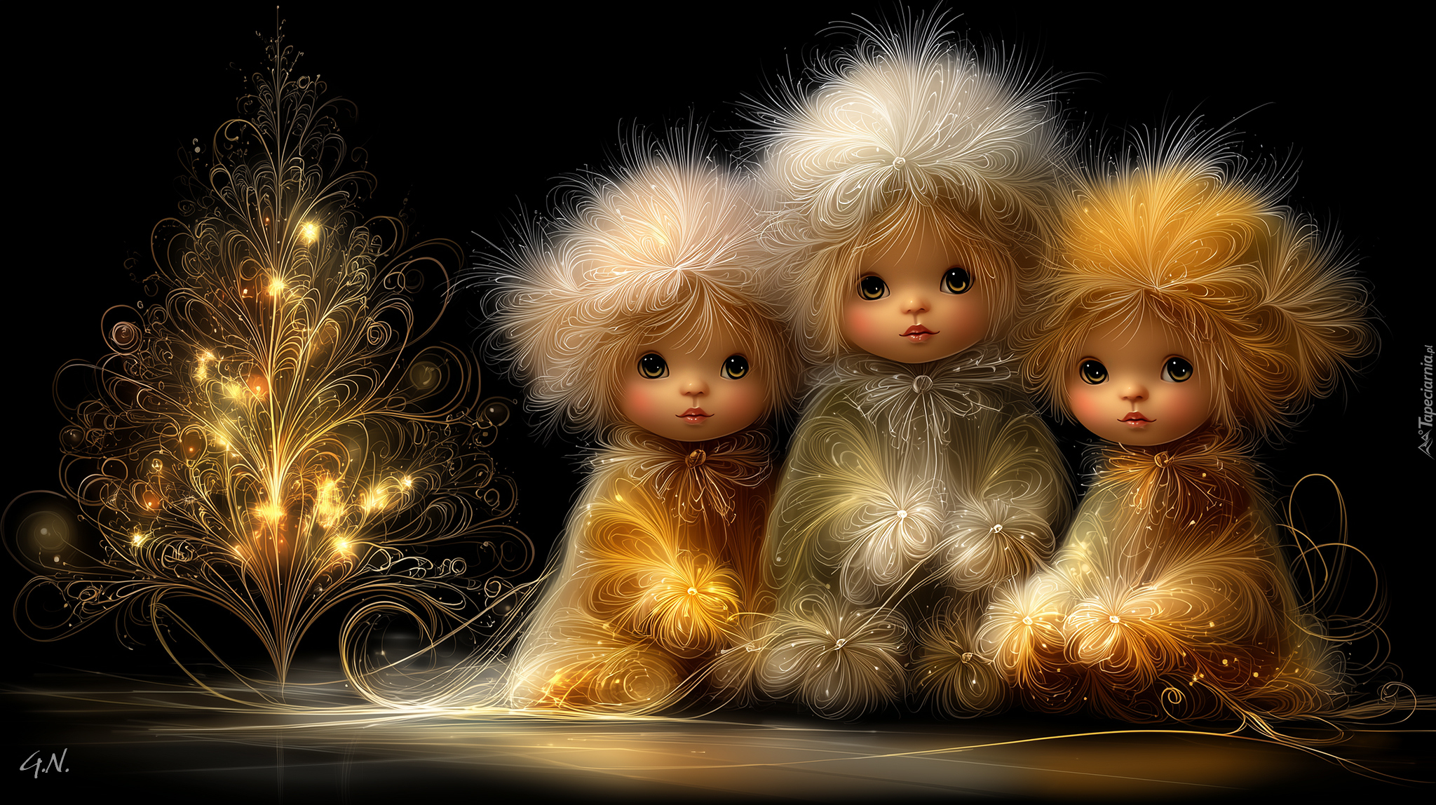 Edytor tapety: Trzy lalki obok oświetlonego drzewka
