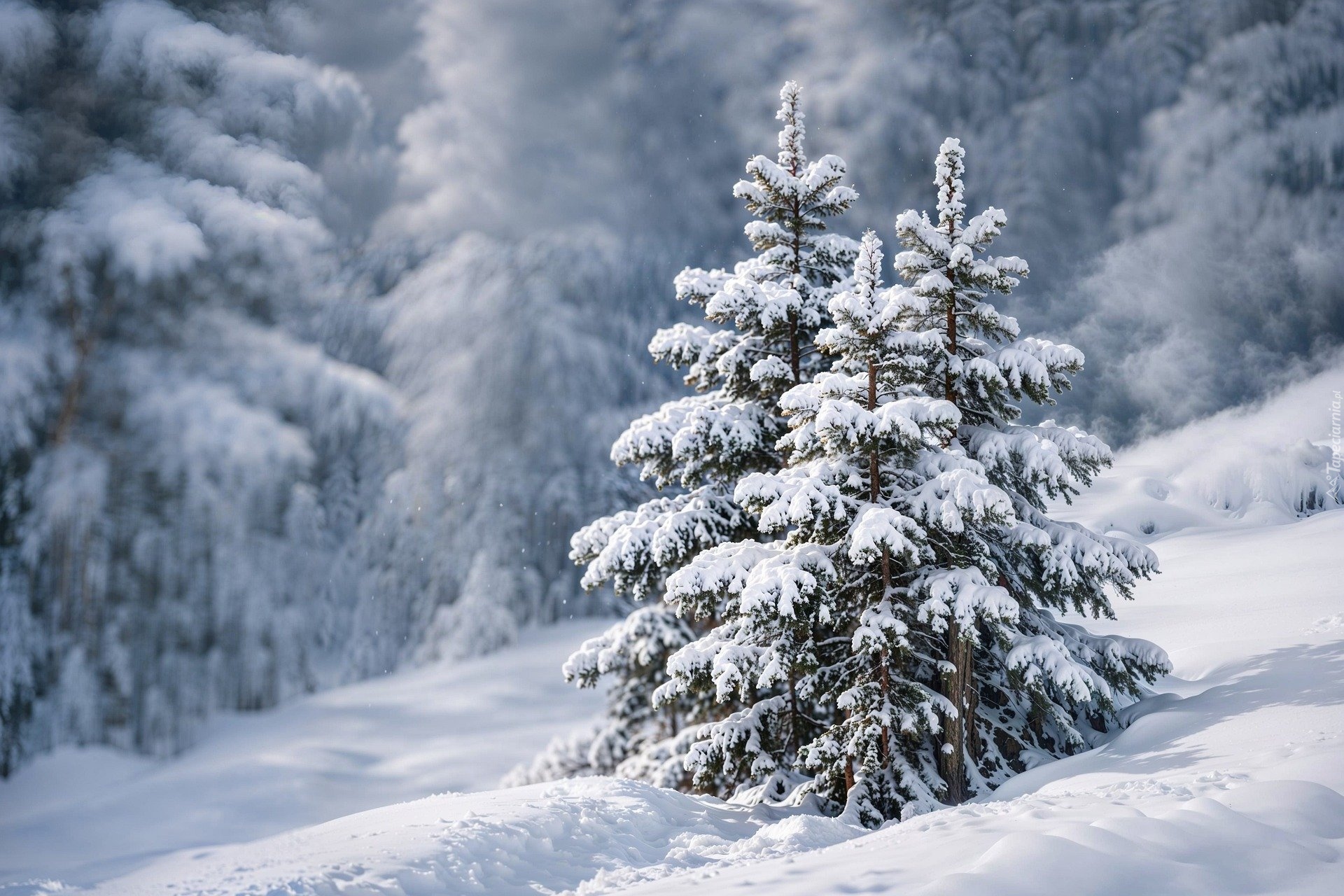Edytor tapety: Ośnieżone choinki na zboczu zimową porą