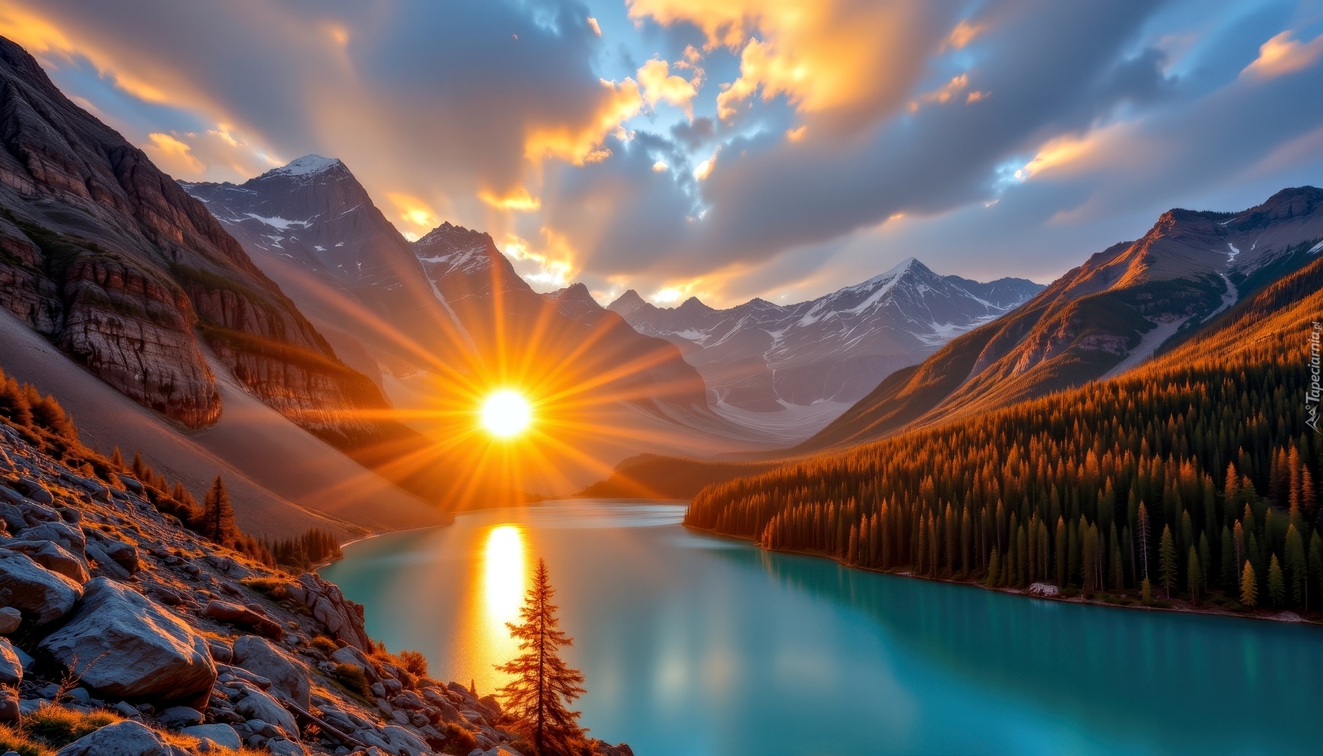 Edytor tapety: Lasy nad górskim jeziorem w promieniach słońca