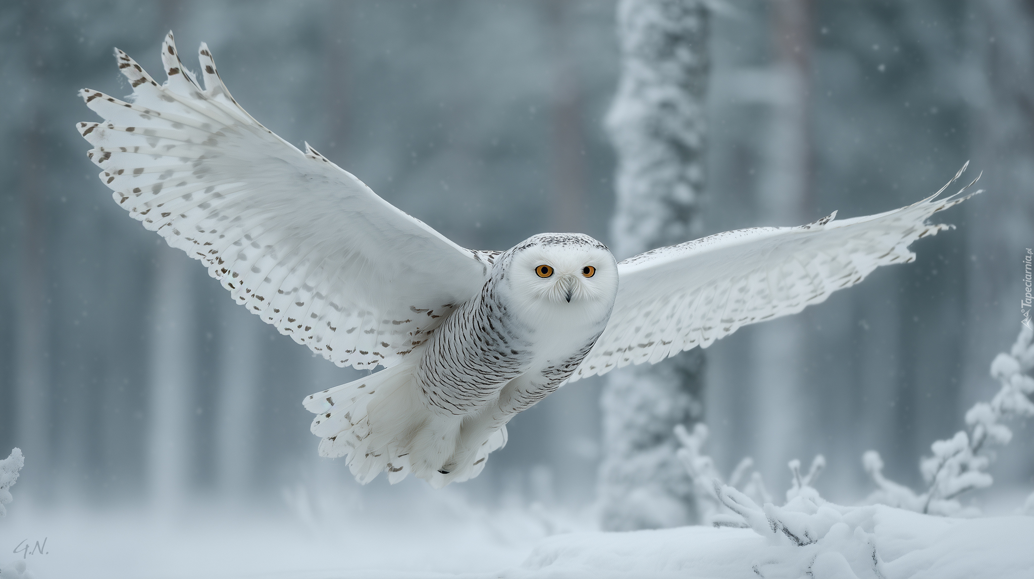 Edytor tapety: Sowa śnieżna z rozpostartymi skrzydłami w locie