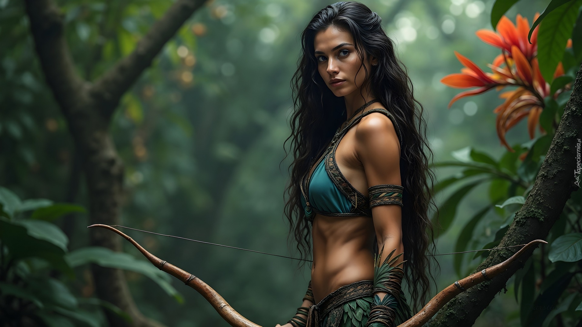 Edytor tapety: Długowłosa brunetka jako wojowniczka z łukiem