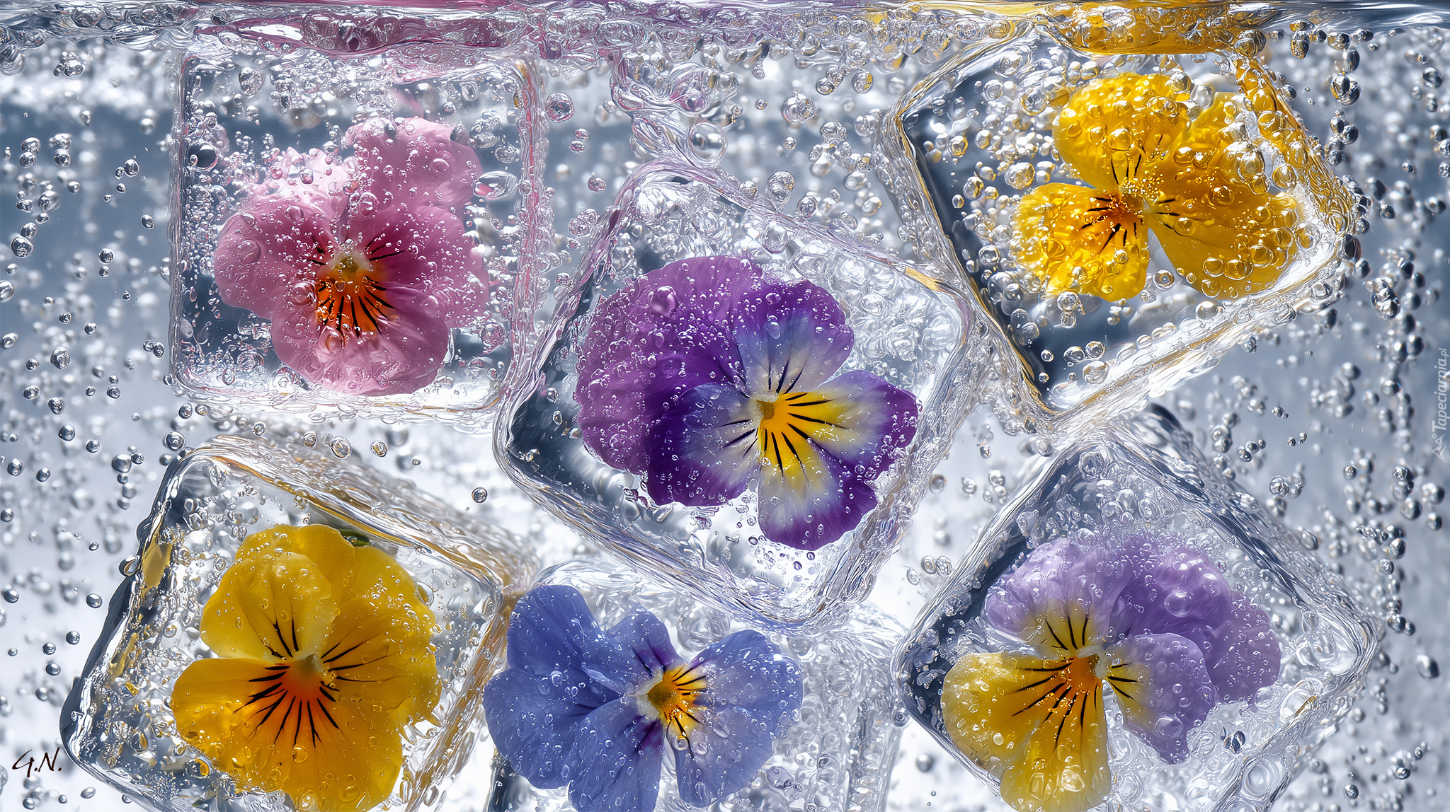 Edytor tapety: Kolorowe bratki w kostkach lodu
