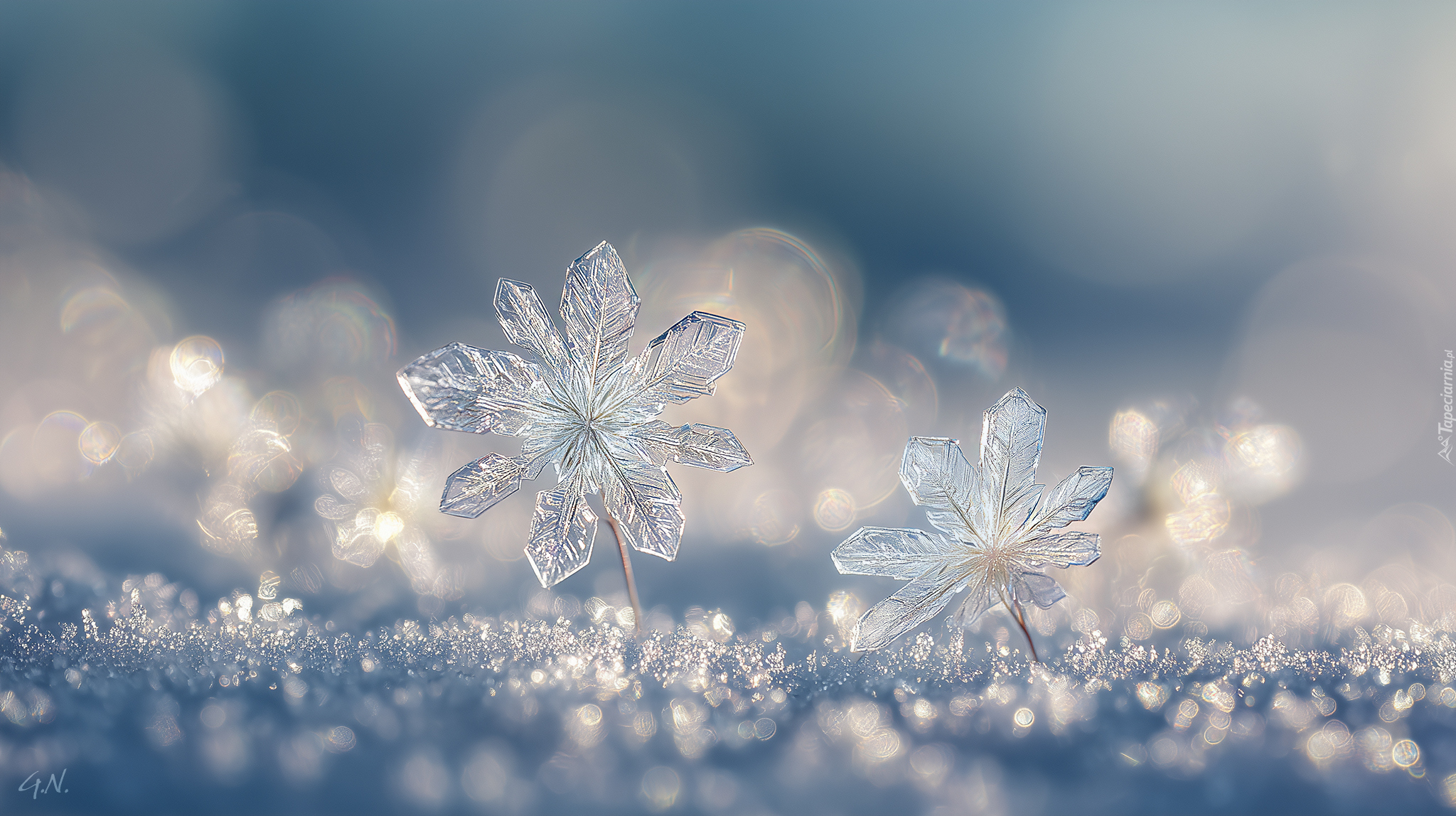 Edytor tapety: Rozświetlone słonecznym blaskiem śnieżynki na śniegu