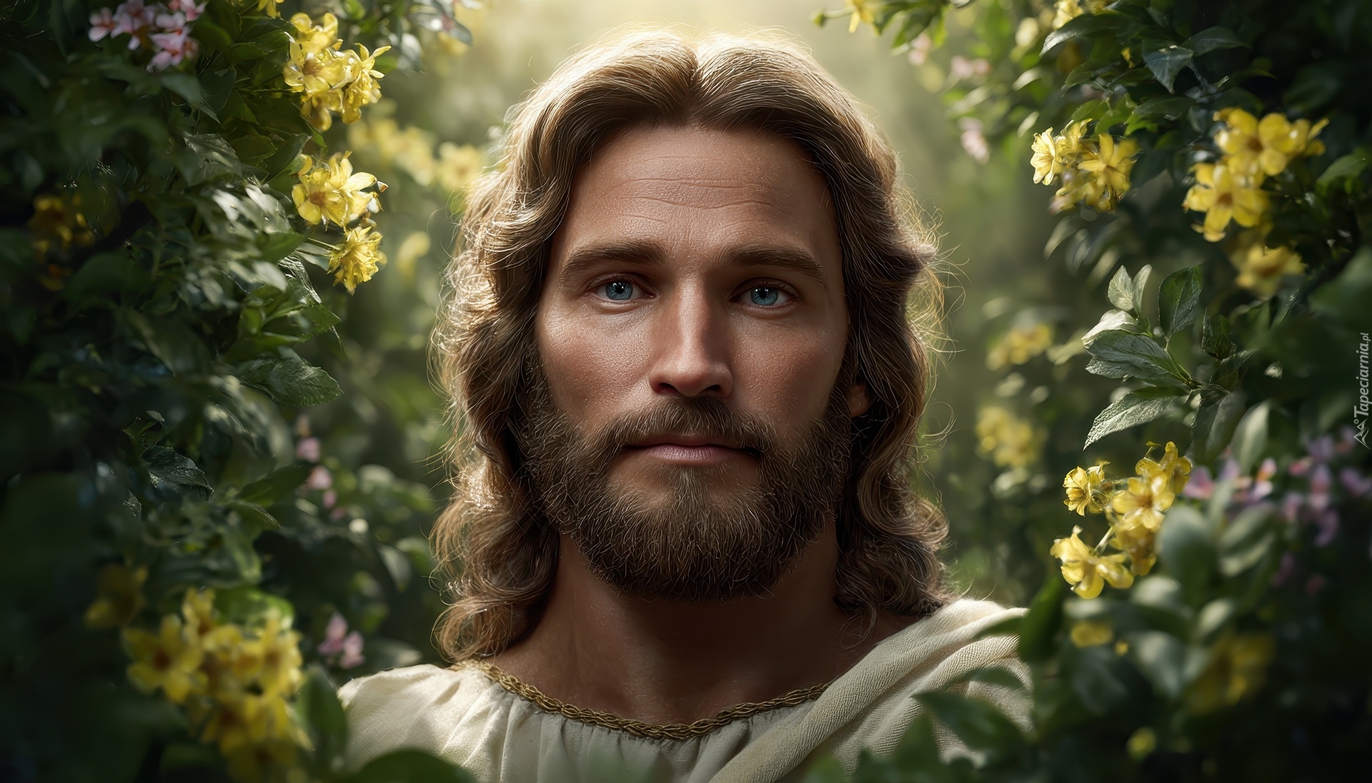 Edytor tapety: Twarz Jezusa Chrystusa obok zielonych roślin