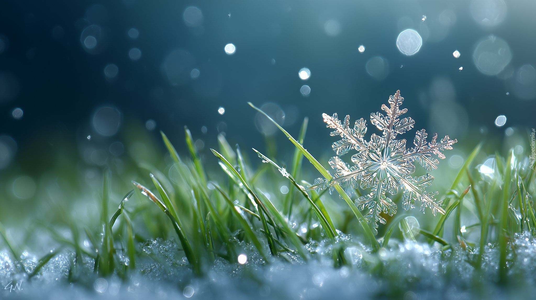 Edytor tapety: Płatek śniegu w zielonych źdźbłach trawy