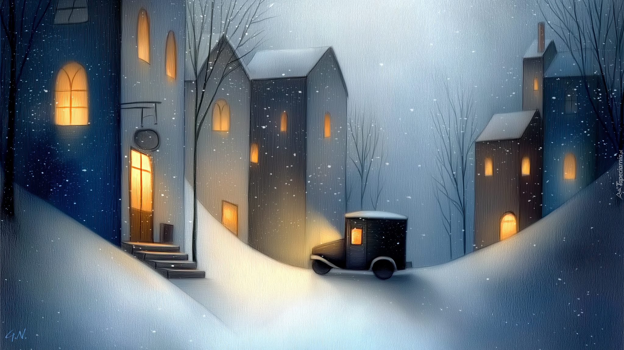 Edytor tapety: Samochód przed oświetlonymi domami w zimowej scenerii
