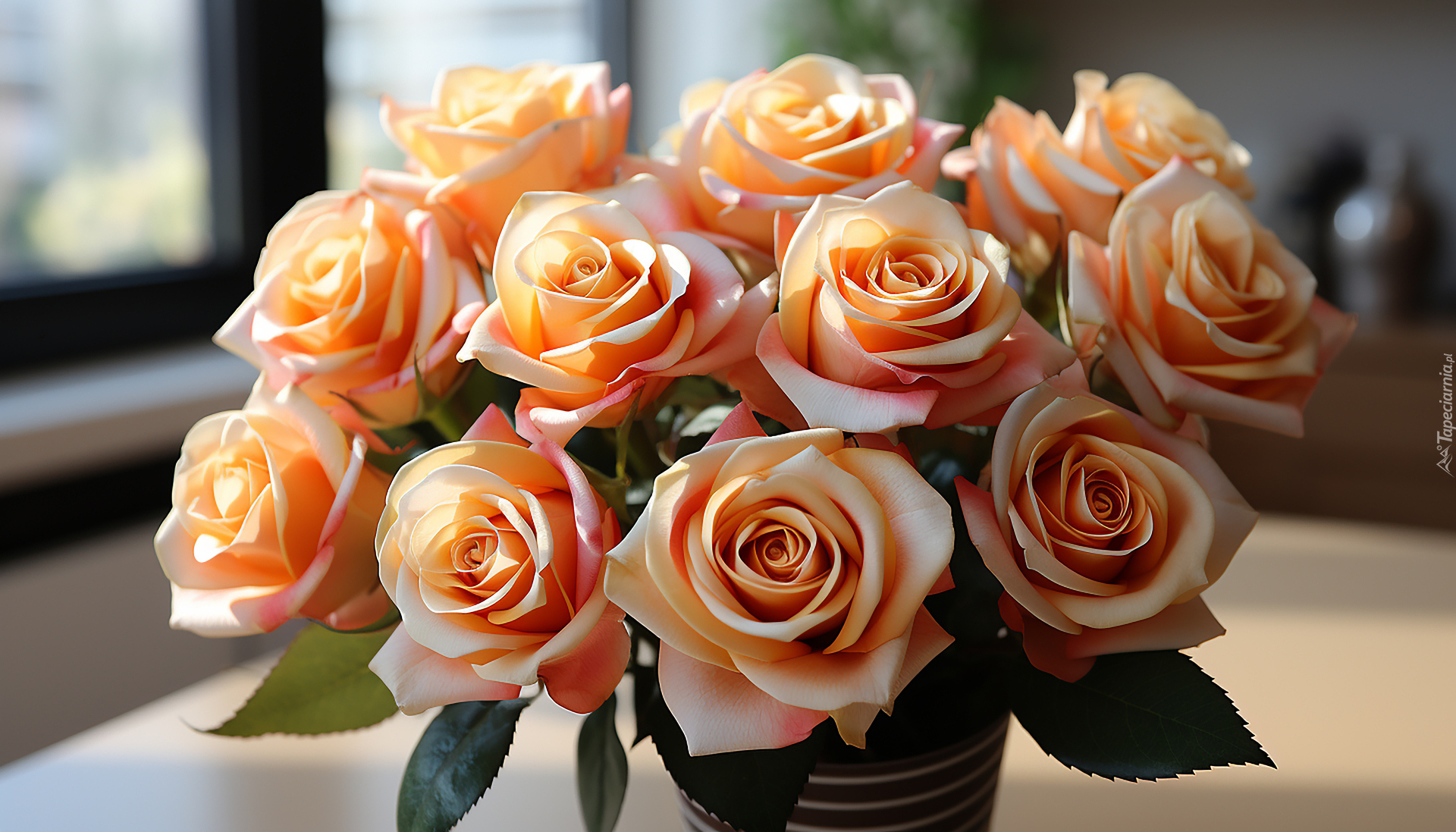 Edytor tapety: Bukiet brzoskwiniowych róż w wazonie