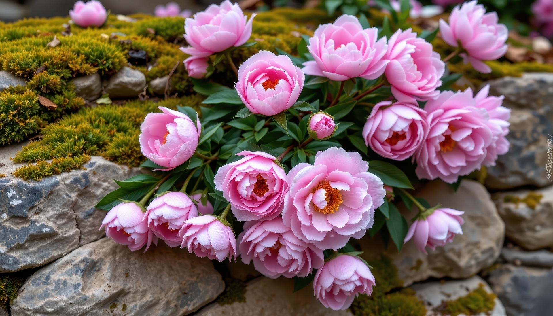 Edytor tapety: Różowe piwonie i mech na kamieniach