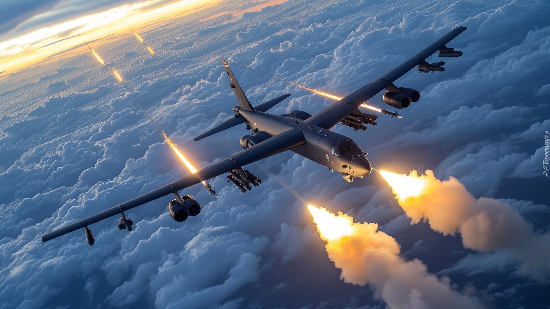 Edytor tapety: Samolot wojskowy podczas walki ponad chmurami