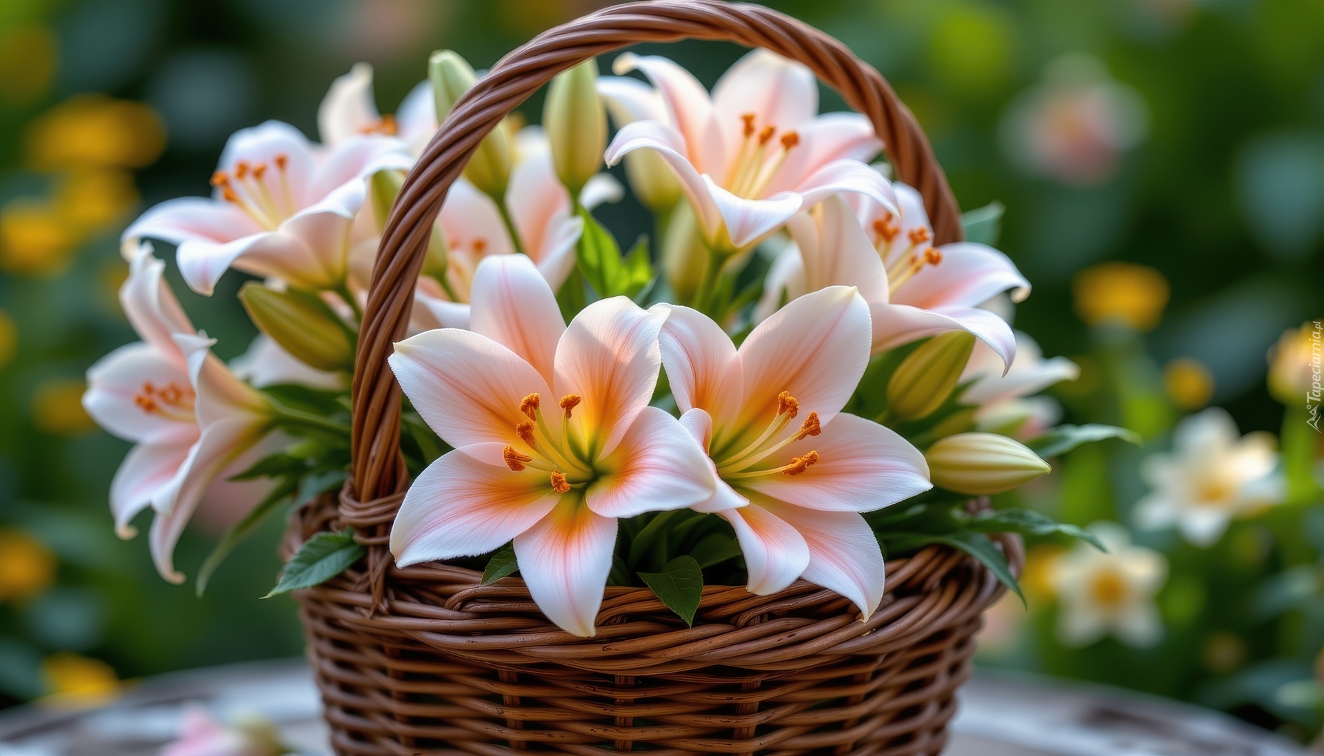 Edytor tapety: Biało-pomarańczowe lilie w wiklinowym koszyku