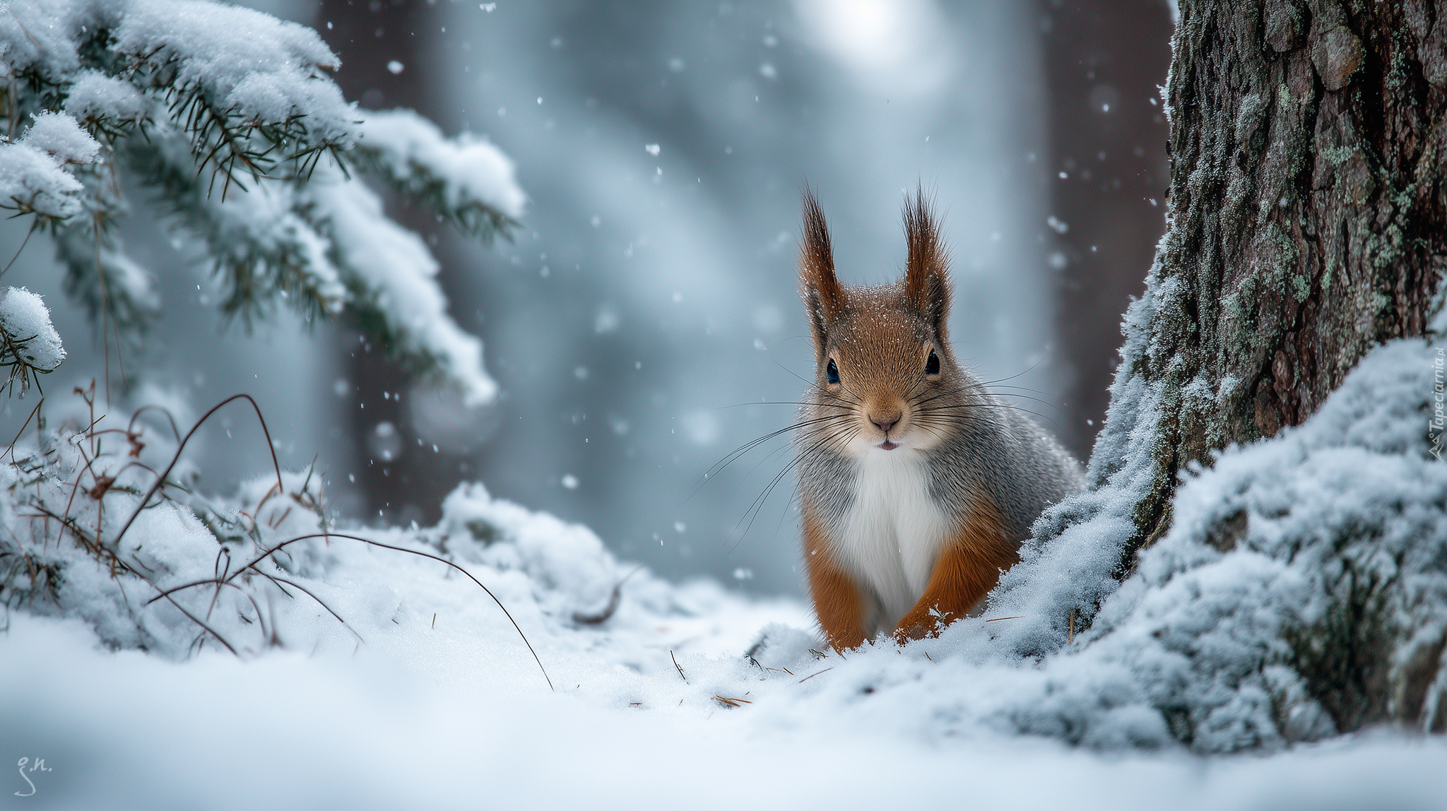 Edytor tapety: Wiewiórka na śniegu obok ośnieżonego pnia drzewa
