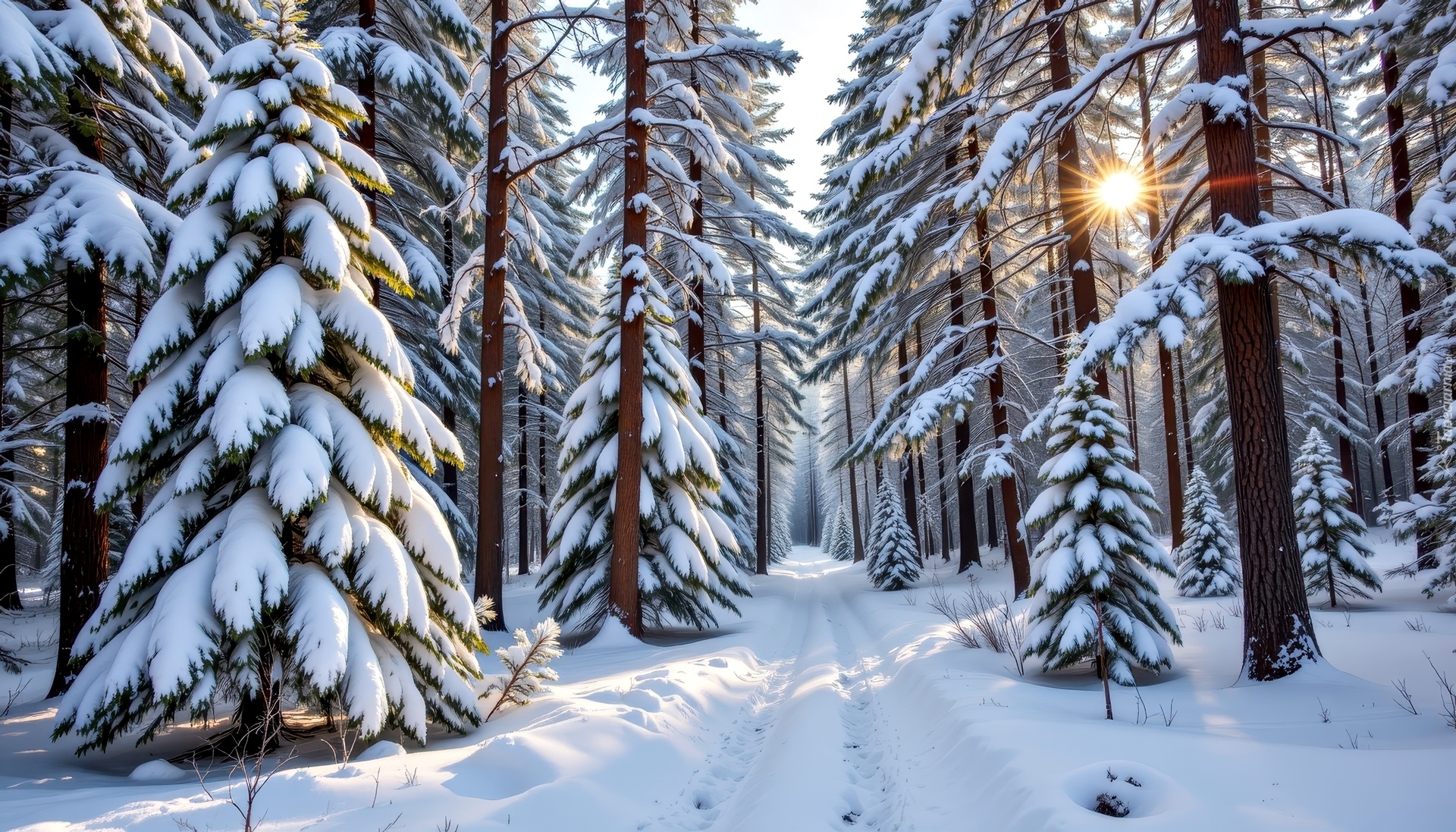 Edytor tapety: Zaśnieżona droga w zimowym lesie w promieniach słońca
