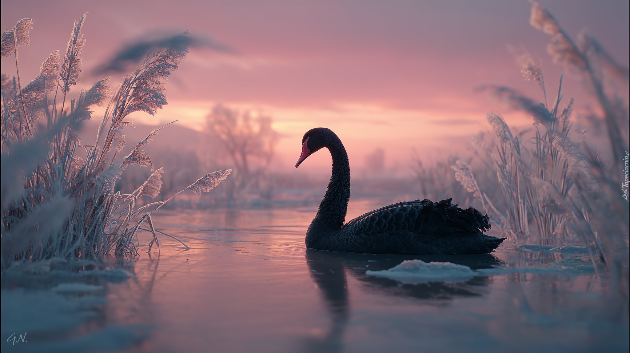 Edytor tapety: Czarny łabędź na jeziorze wśród oszronionych traw zimą