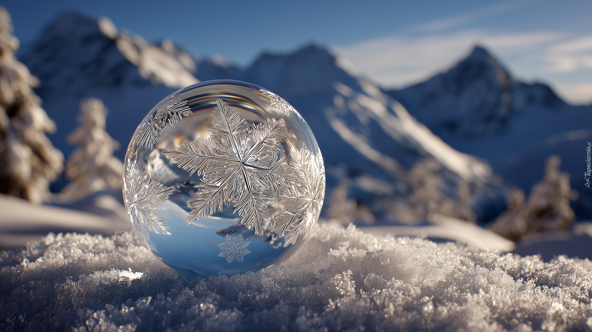 Edytor tapety: Śnieżynki na szklanej kuli na śniegu