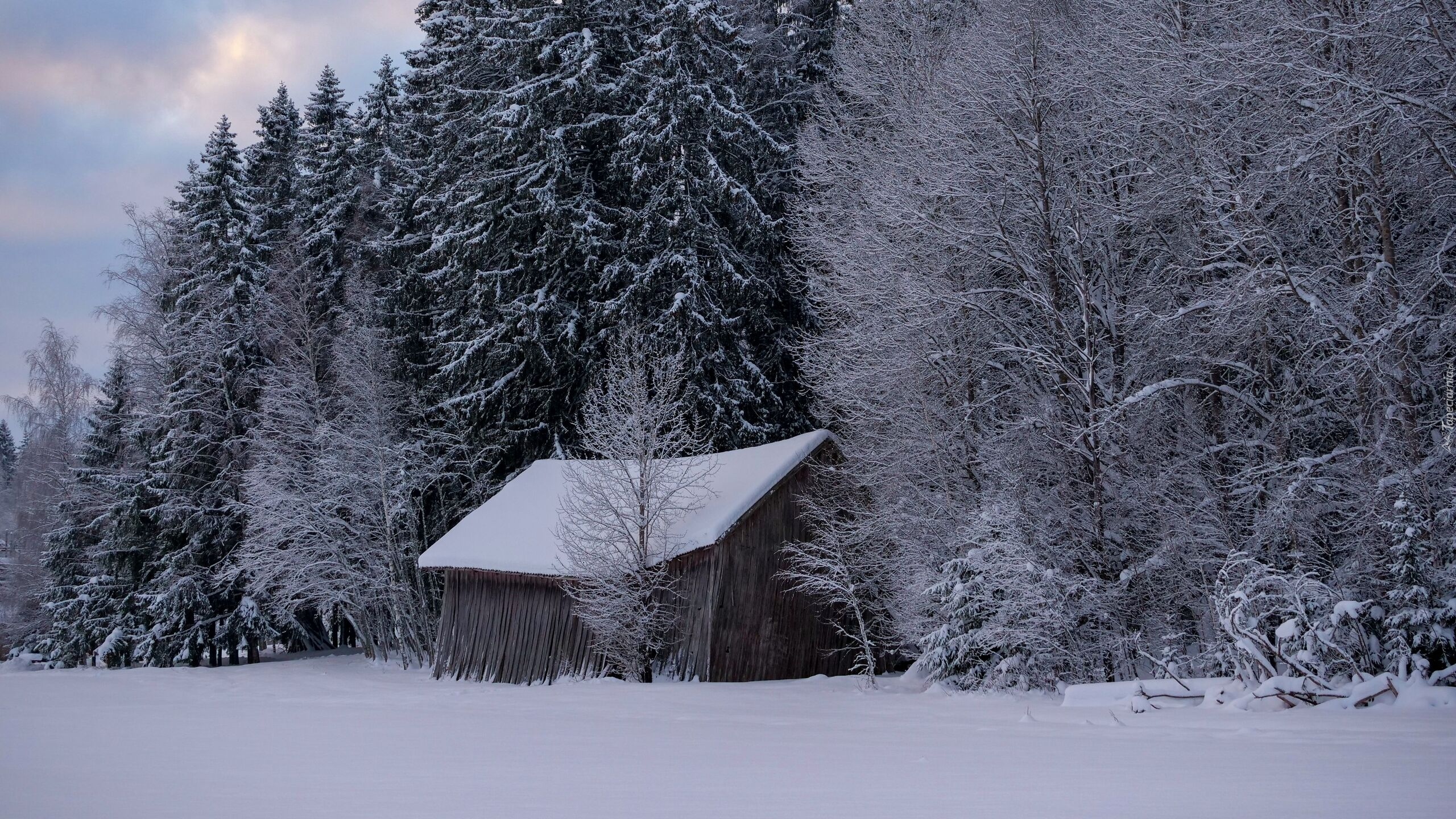 Edytor tapety: Szopa na skraju lasu pod ośnieżonymi drzewami
