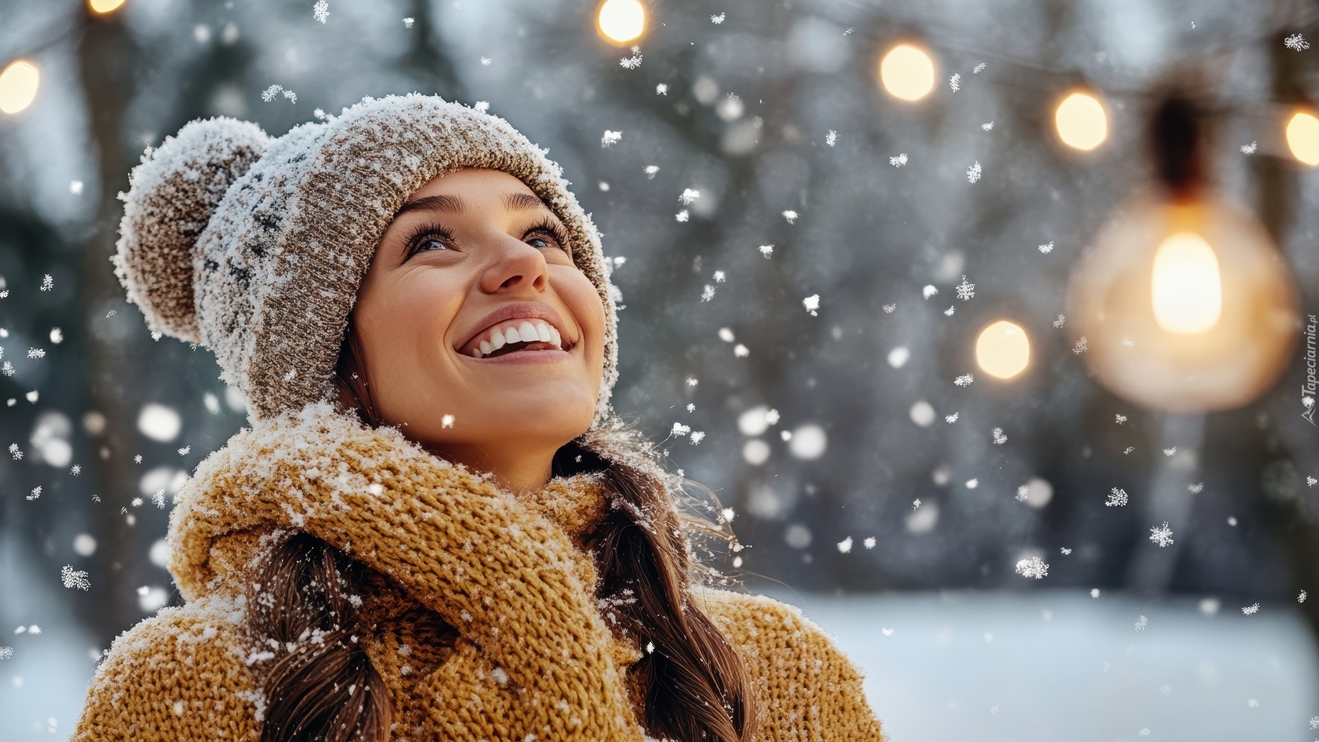 Edytor tapety: Uśmiechnięta kobieta w ośnieżonej czapce w padającym śniegu