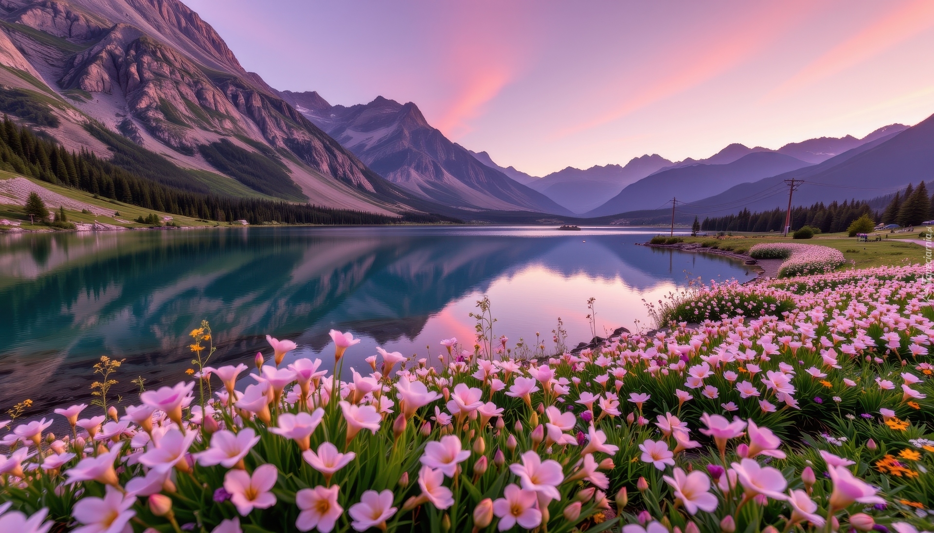 Edytor tapety: Różowe kwiaty na łące nad górskim jeziorem