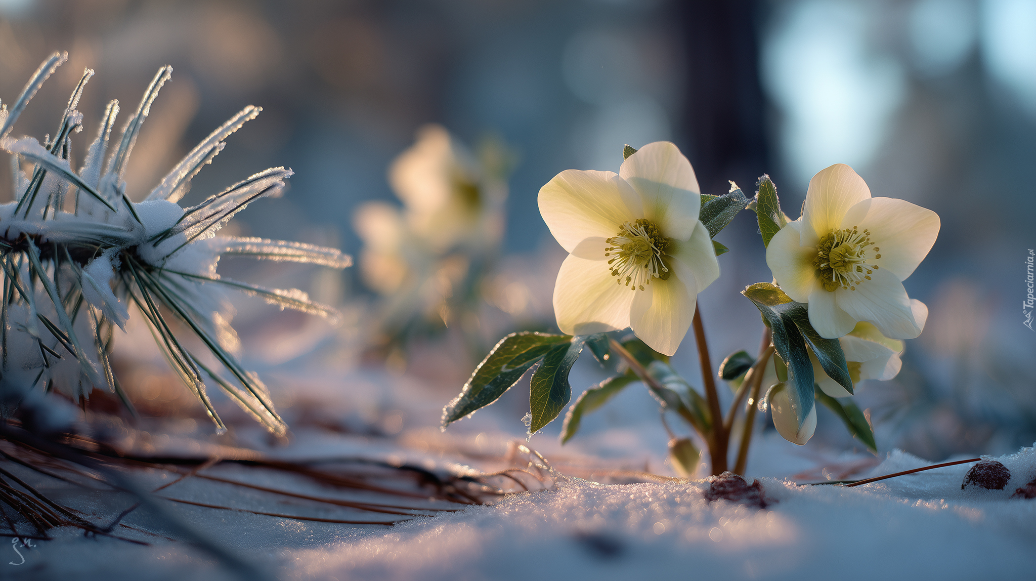 Edytor tapety: Dwa ciemierniki w śniegu obok ośnieżonej gałązki sosny