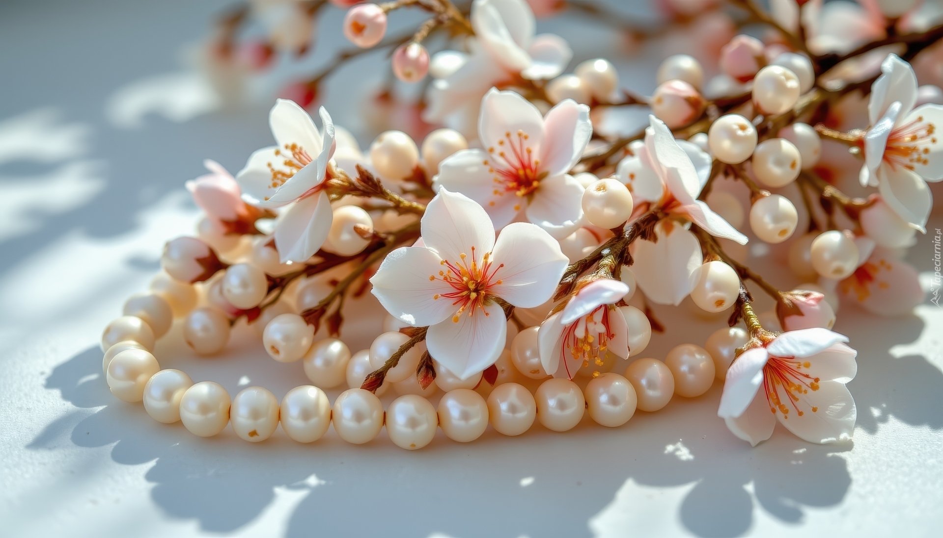 Edytor tapety: Gałązka z białymi kwiatami i naszyjnik z pereł