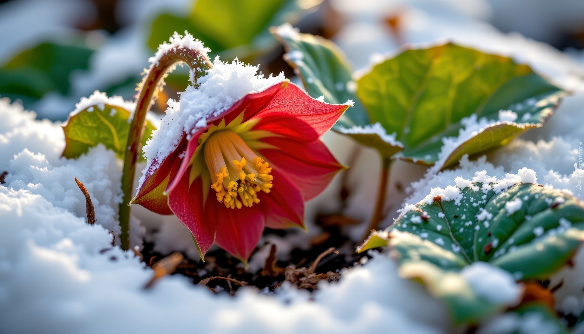 Edytor tapety: Czerwony kwiat i liście w śniegu