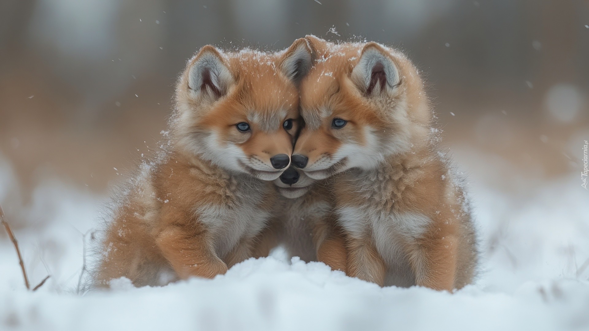 Edytor tapety: Trzy młode liski na śniegu