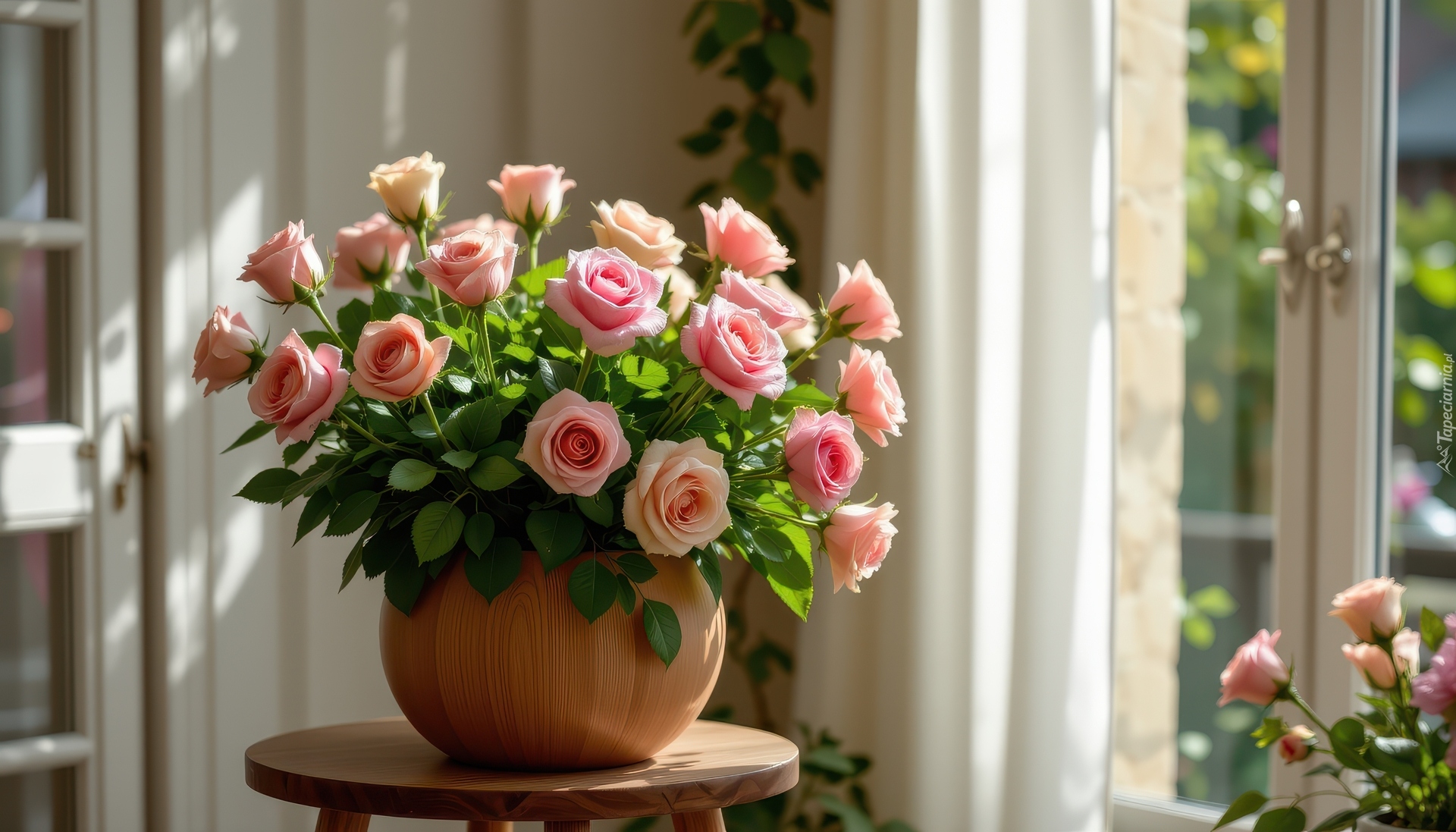 Edytor tapety: Różowe róże w wazonie na stoliku obok okna