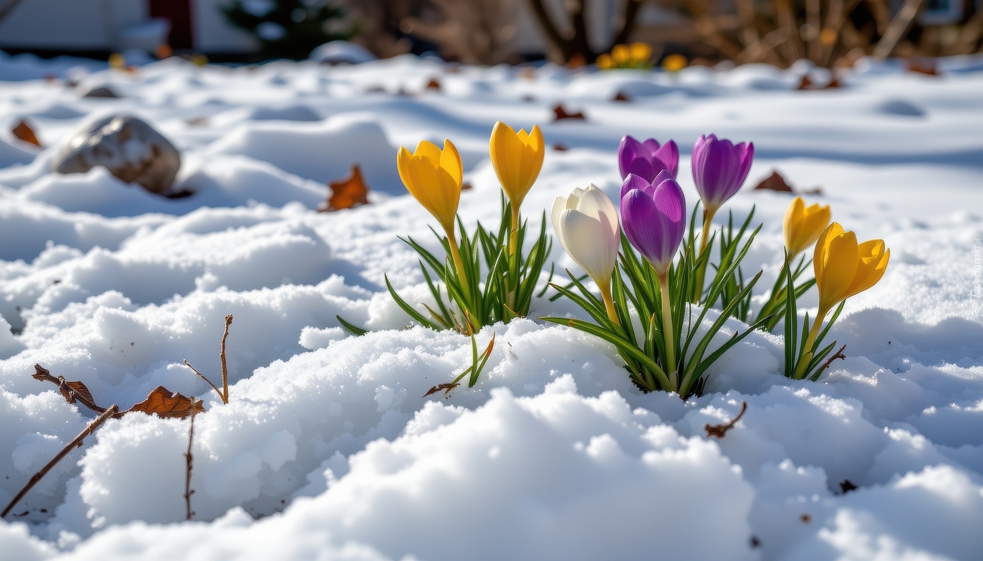 Edytor tapety: Kępki rozświetlonych kolorowych krokusów w śniegu