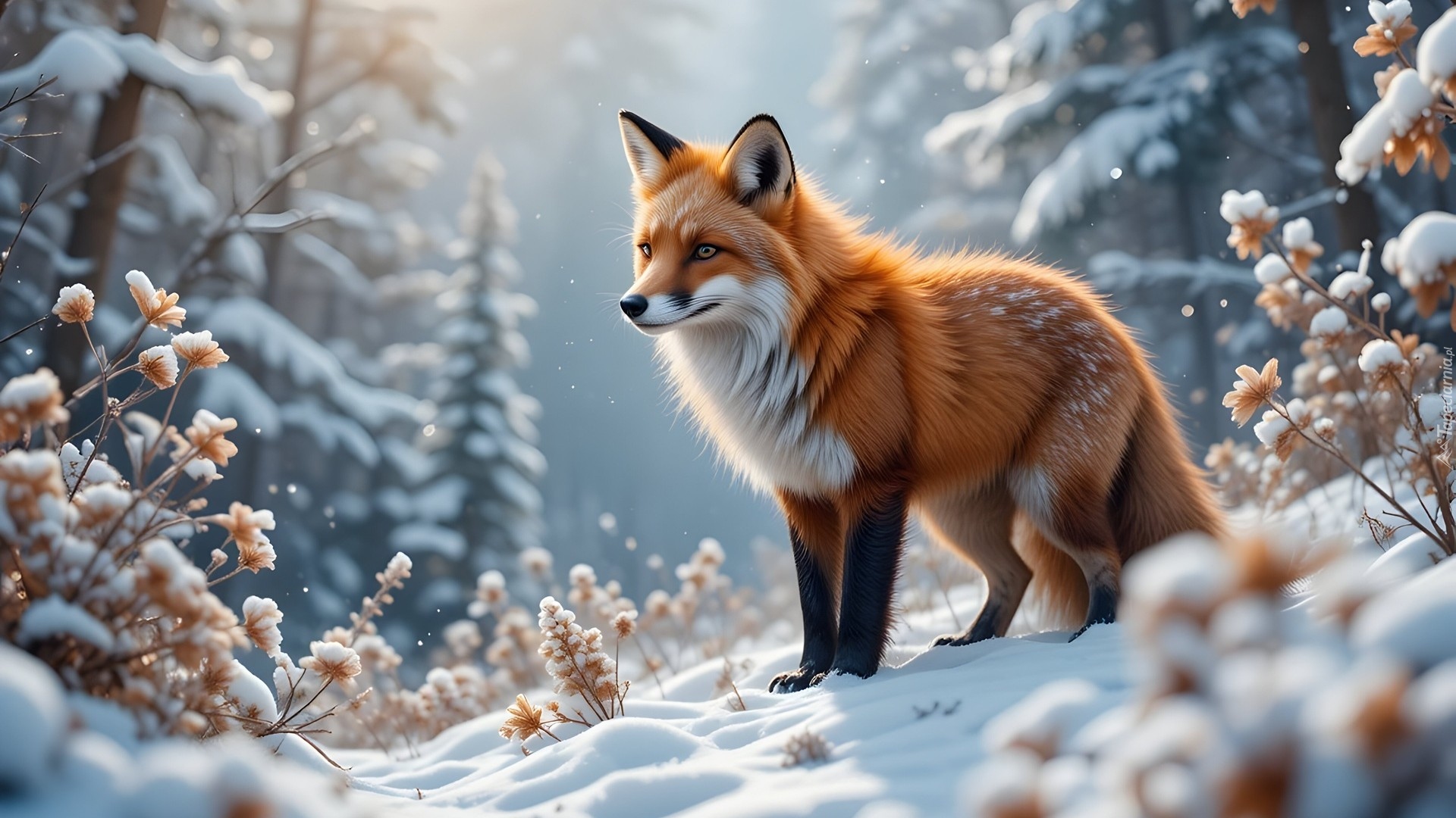 Edytor tapety: Rudy lis i ośnieżone rośliny w zimowym lesie