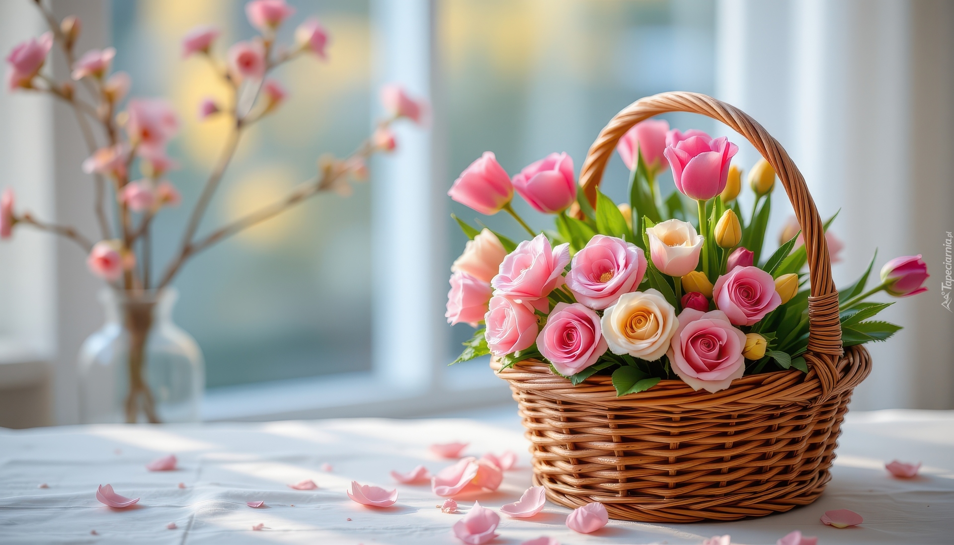 Edytor tapety: Tulipany i róże w wiklinowym koszyku obok okna