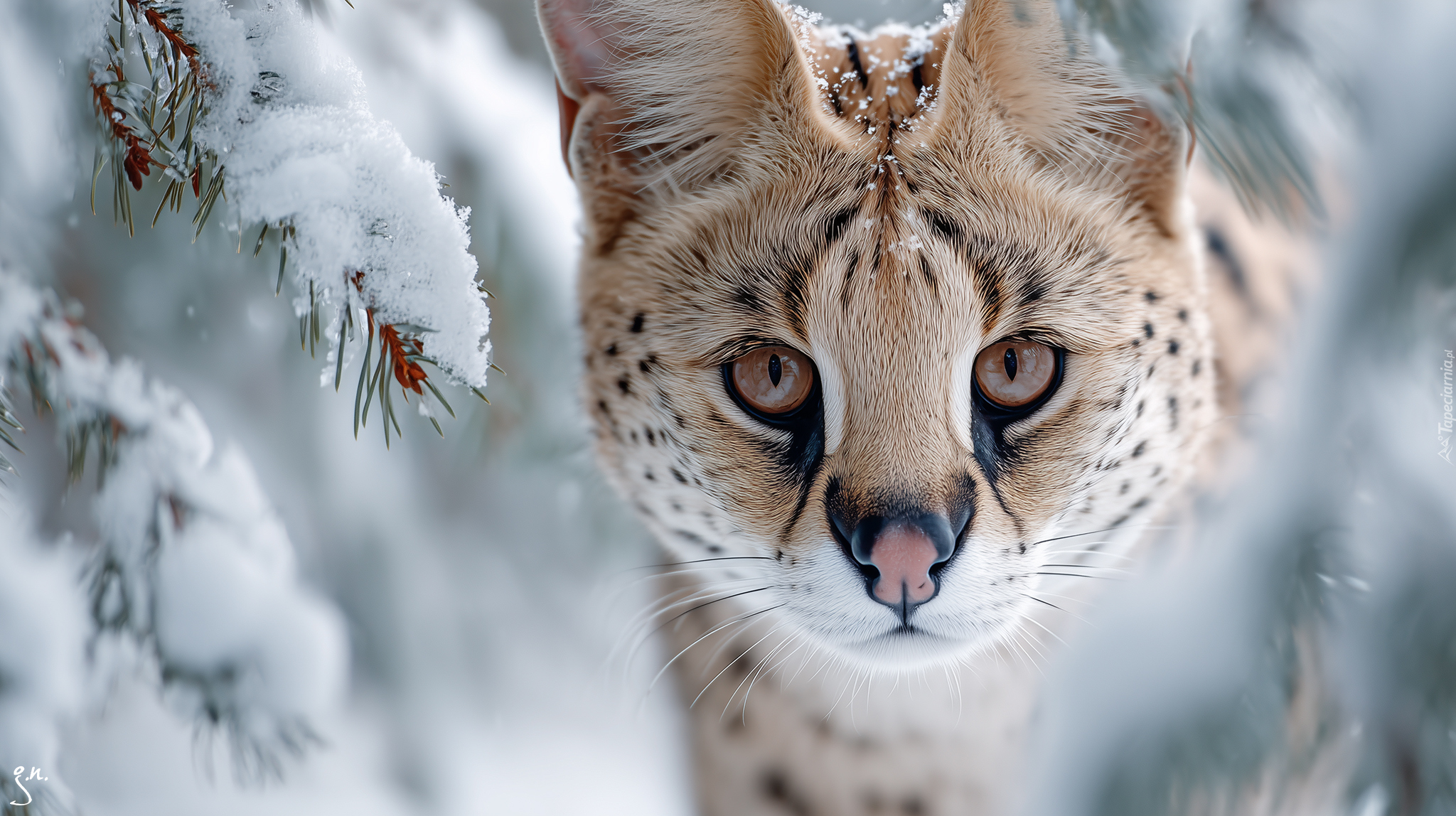 Edytor tapety: Głowa serwala obok ośnieżonych iglastych gałązek