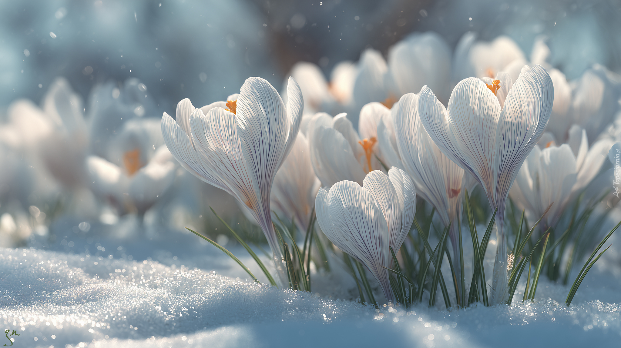 Edytor tapety: Rozświetlone słońcem białe krokusy w śniegu