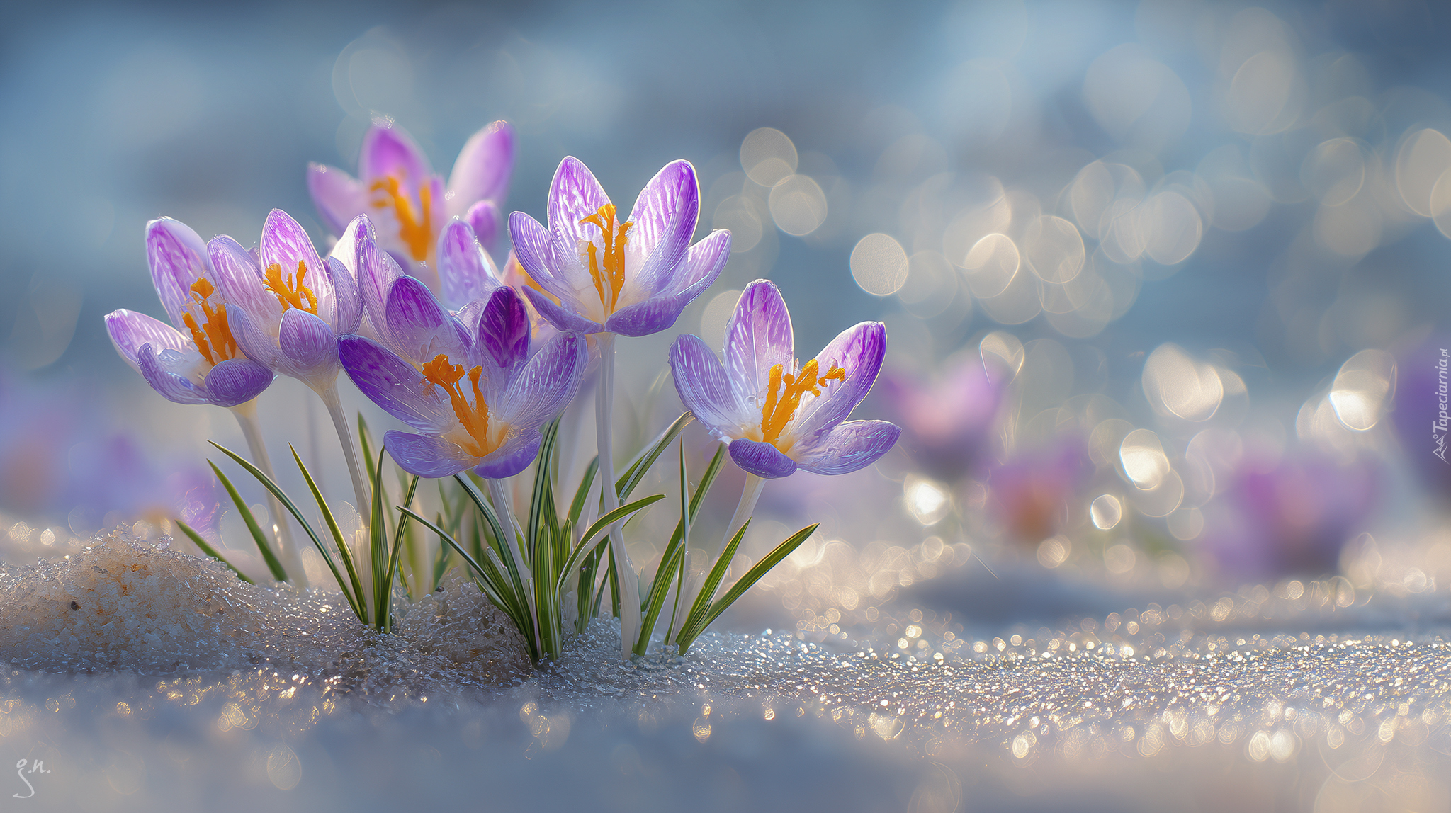 Edytor tapety: Fioletowe rozwinięte krokusy na śniegu