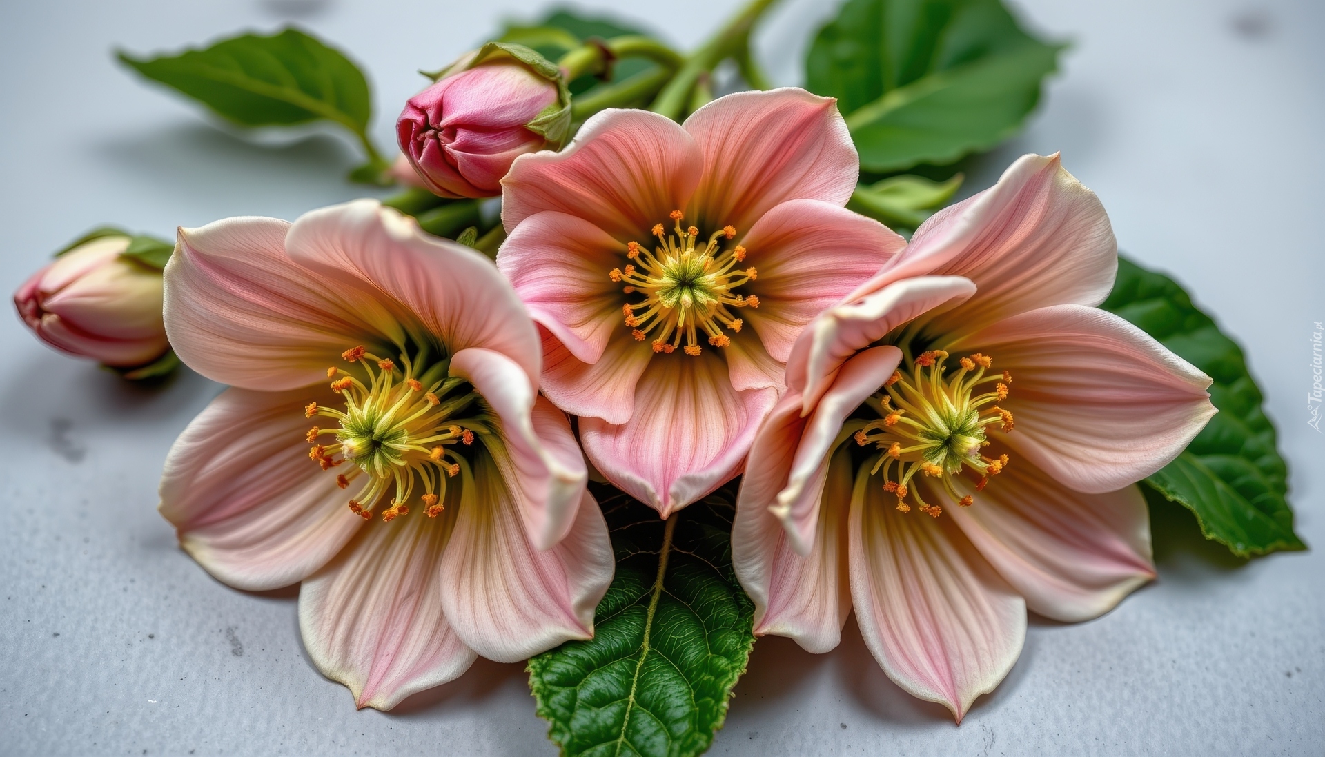 Edytor tapety: Trzy rozkwitnięte kwiaty z pąkami i liśćmi