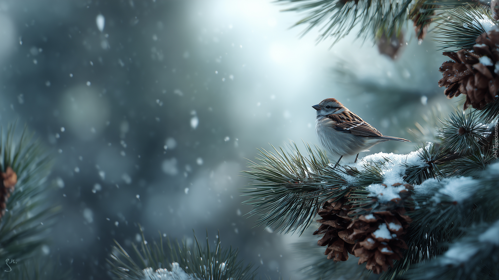 Edytor tapety: Wróbel na ośnieżonej gałązce sosny z szyszkami