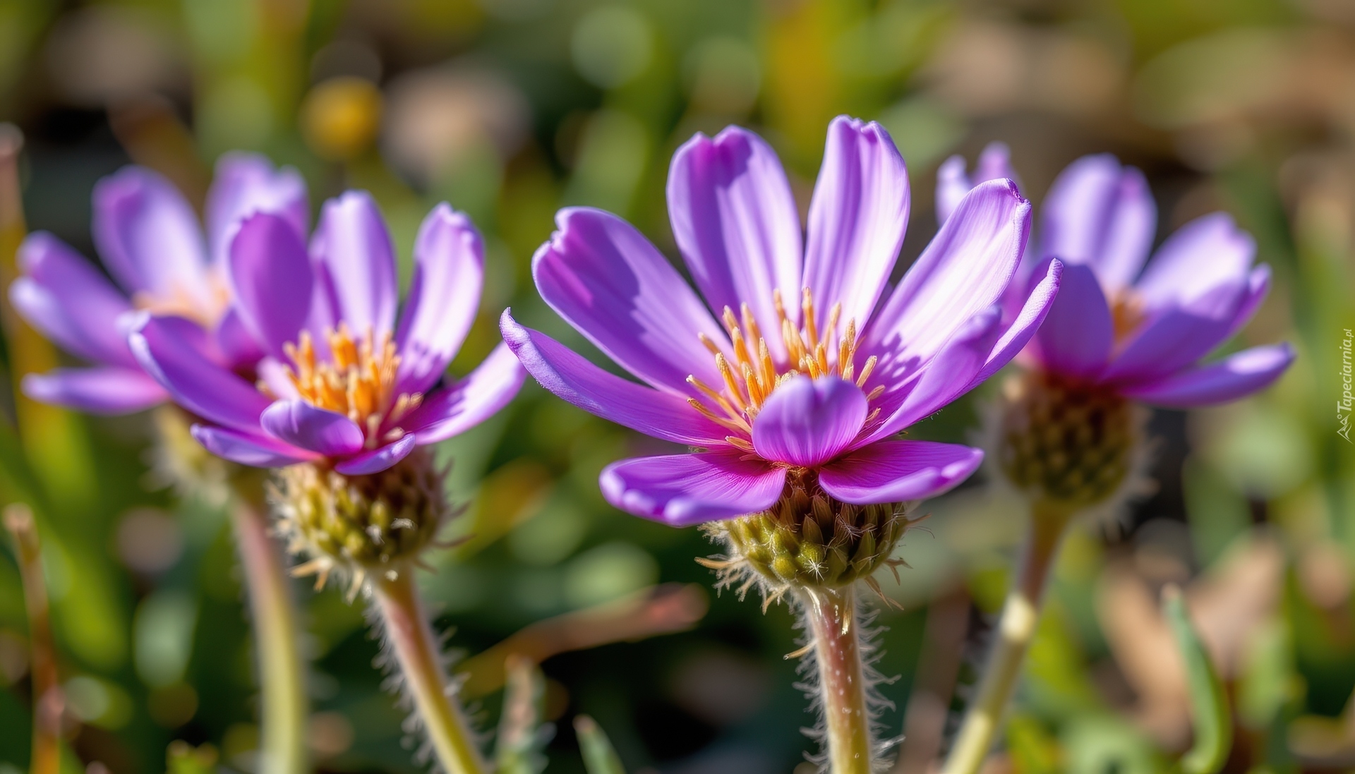 Edytor tapety: Rozświetlone rozkwitnięte fioletowe kwiaty na rozmytym tle