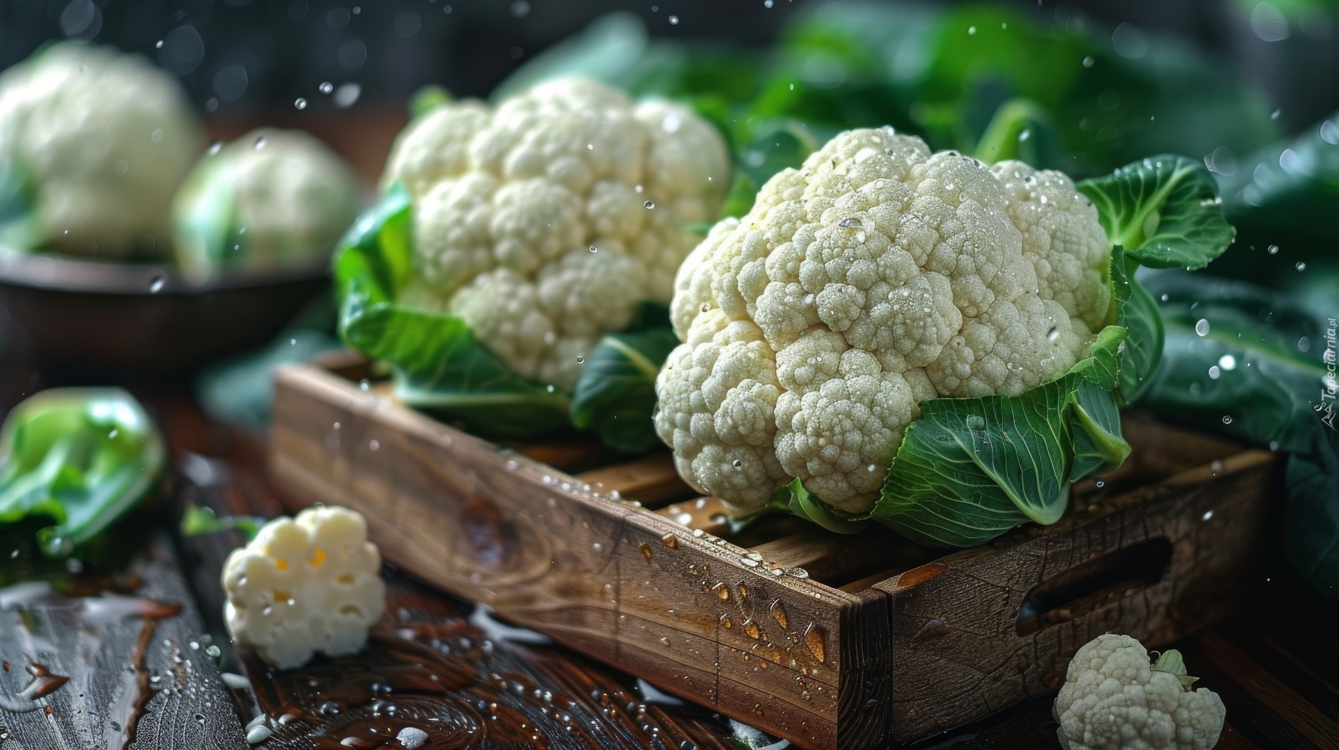 Edytor tapety: Mokre kalafiory w skrzynce w padającym deszczu
