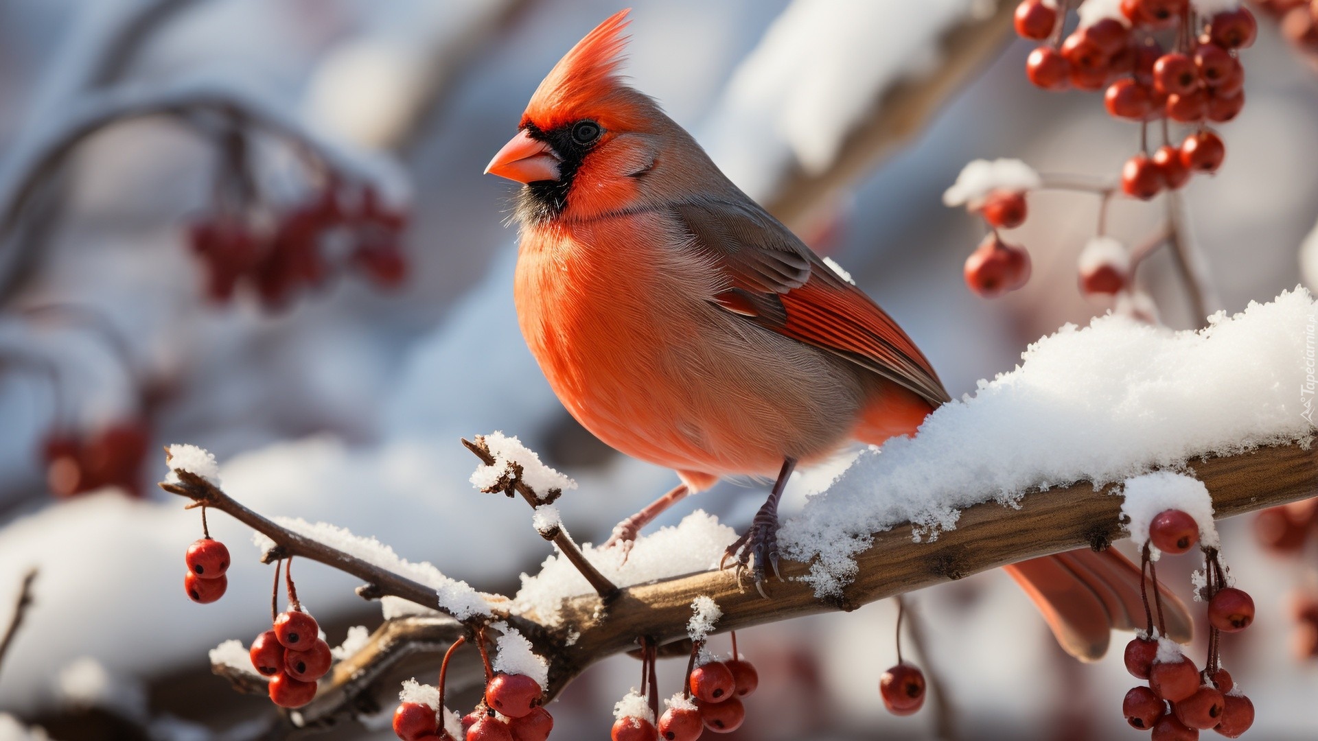 Edytor tapety: Kardynał szkarłatny i czerwone owoce na ośnieżonej gałązce