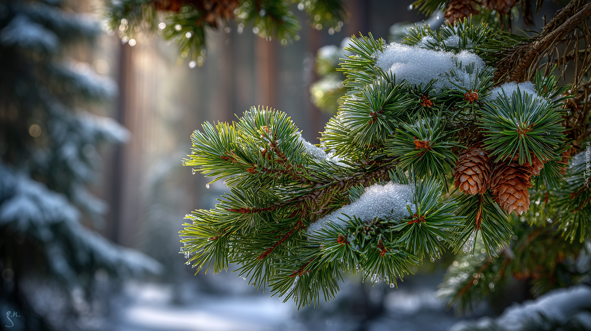 Edytor tapety: Szyszki na ośnieżonej gałązce świerkowej