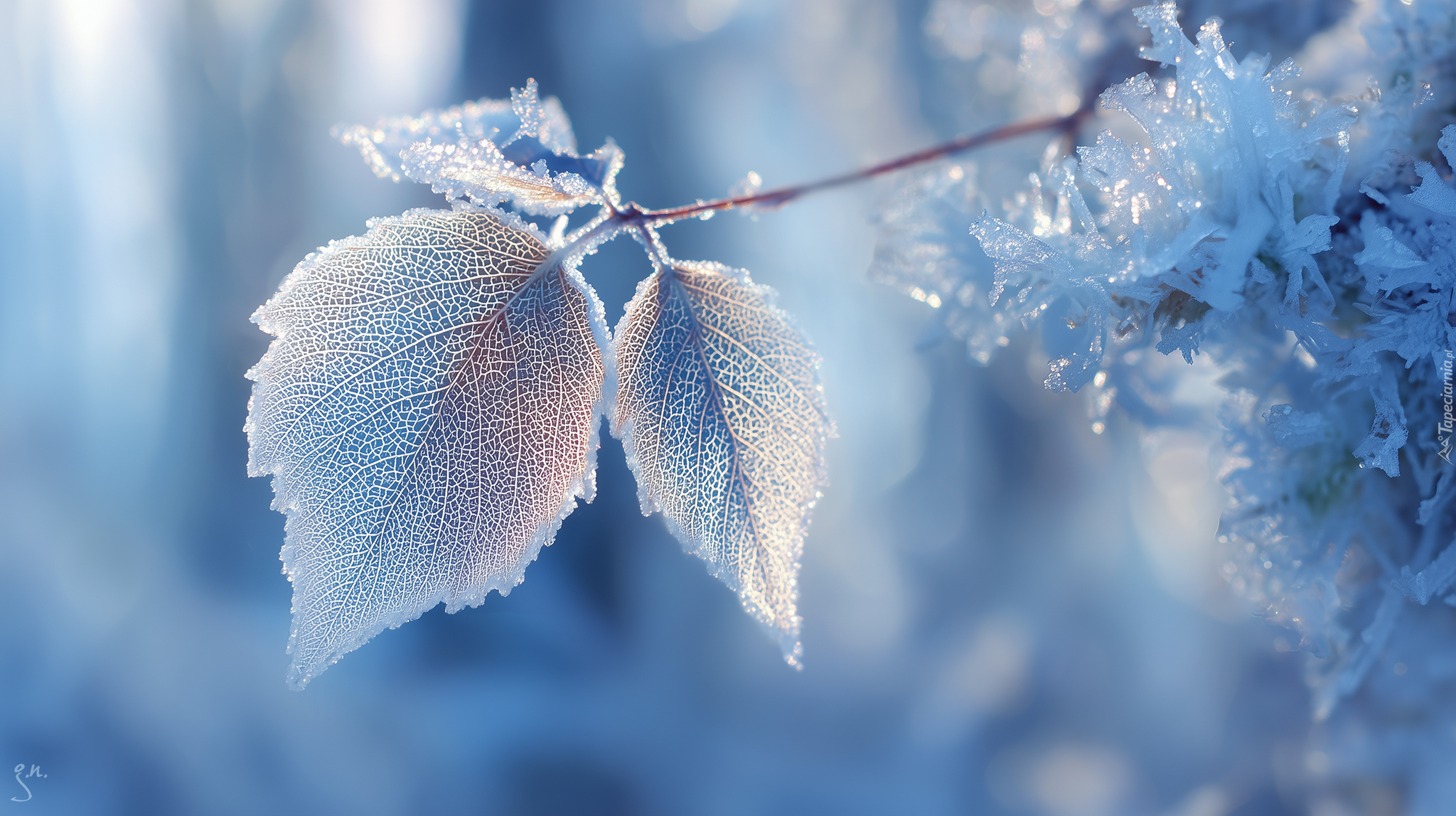 Edytor tapety: Przemarznięte liście na ośnieżonej gałązce