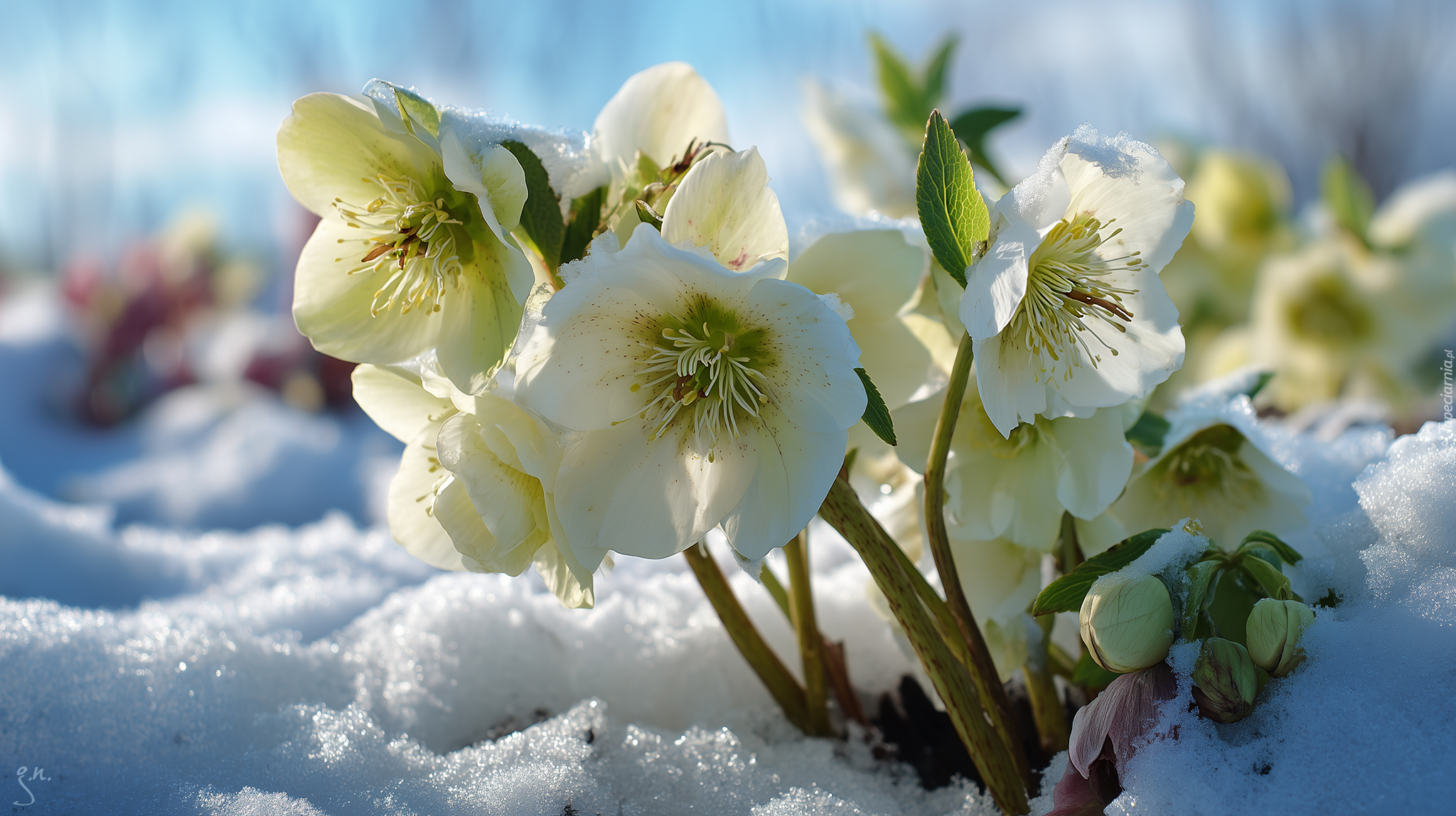 Edytor tapety: Żółte ciemierniki kwitnące w śniegu