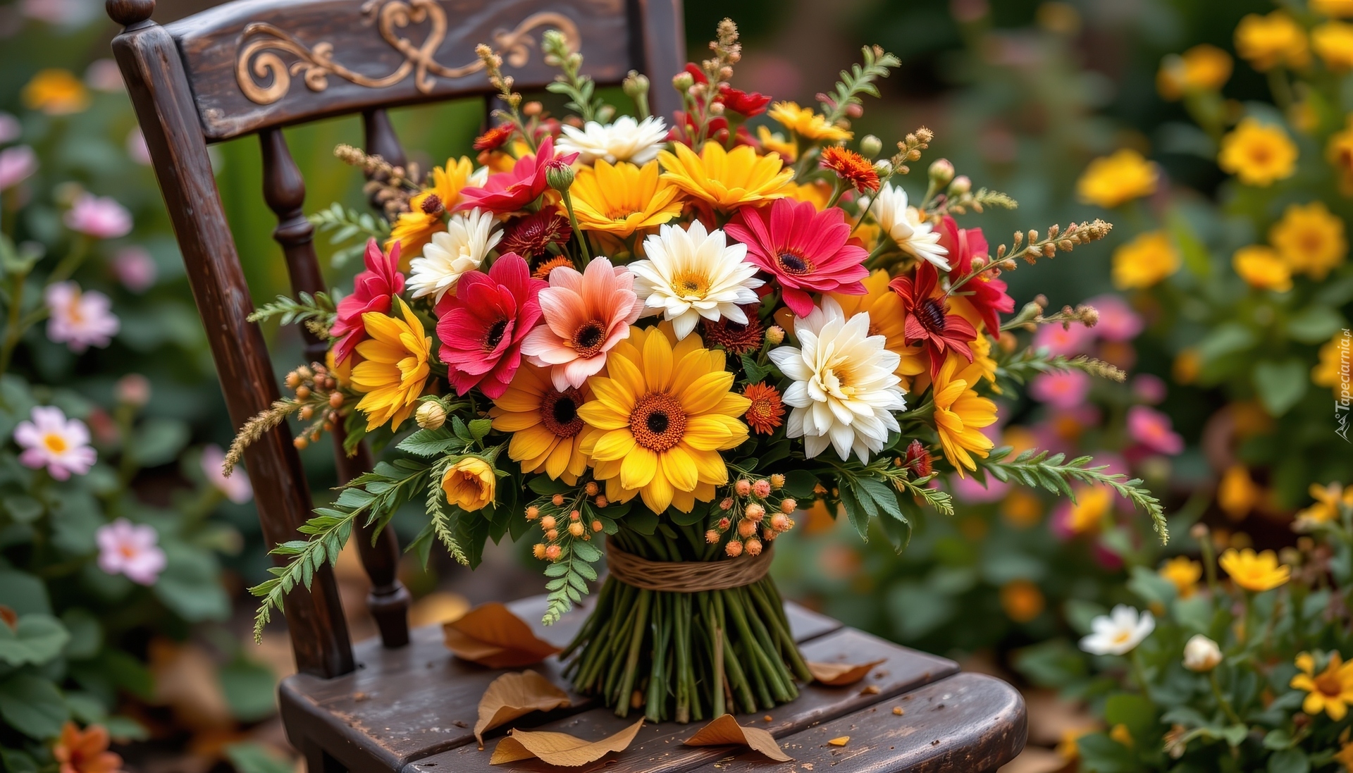 Edytor tapety: Bukiet kolorowych kwiatów na drewnianym krześle