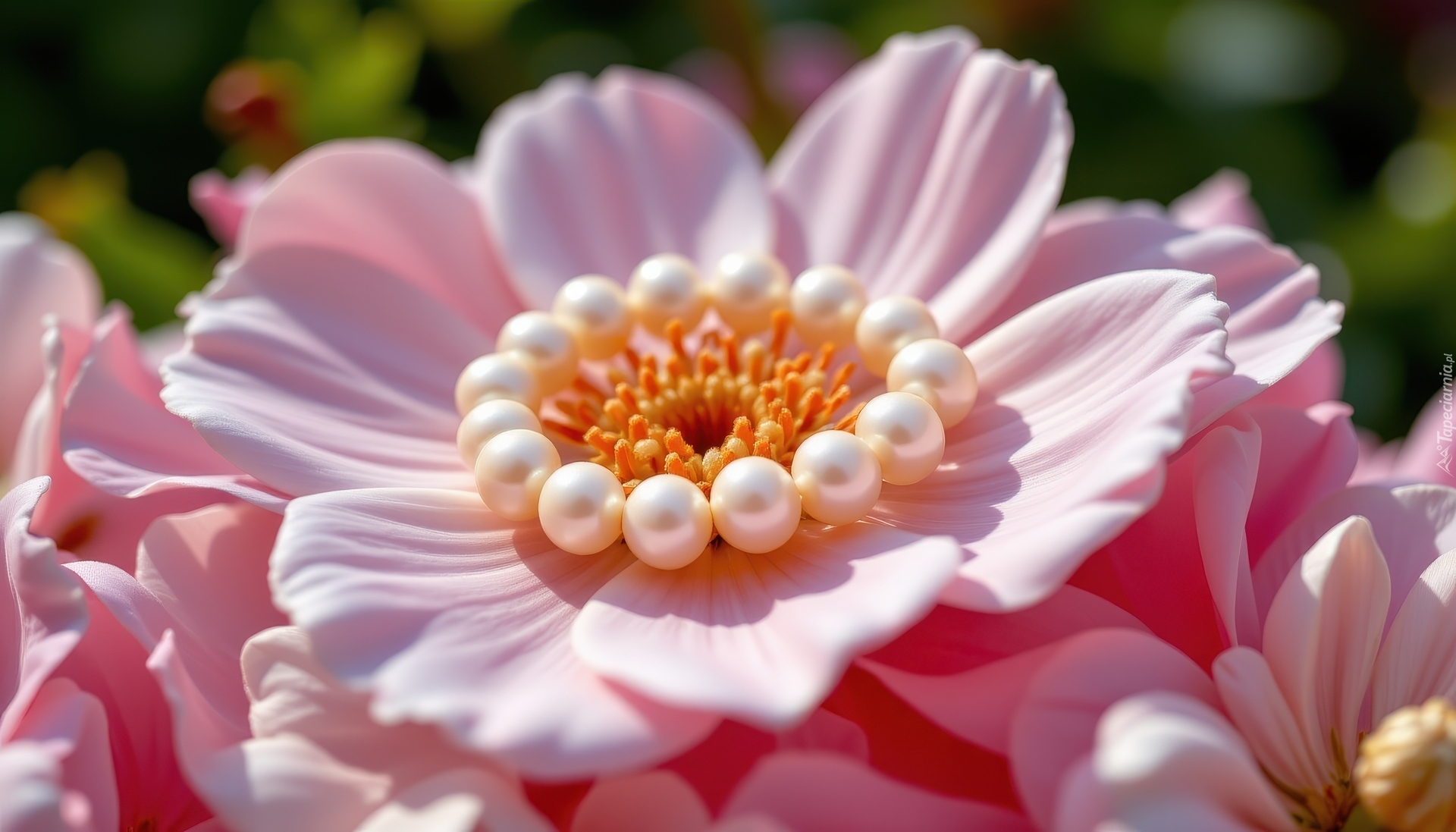 Edytor tapety: Perły wokół pręcików na różowym kwiatku w zbliżeniu